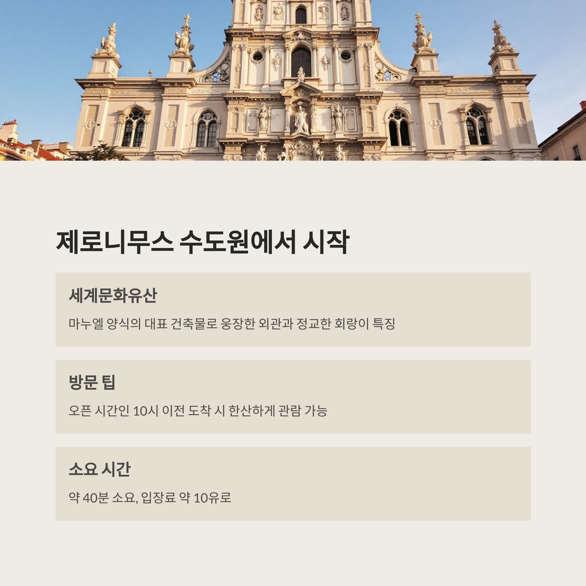 | 10:00 | 제로니무스 수도원 | 역사적 유산 관람, 고요한 시작 |
