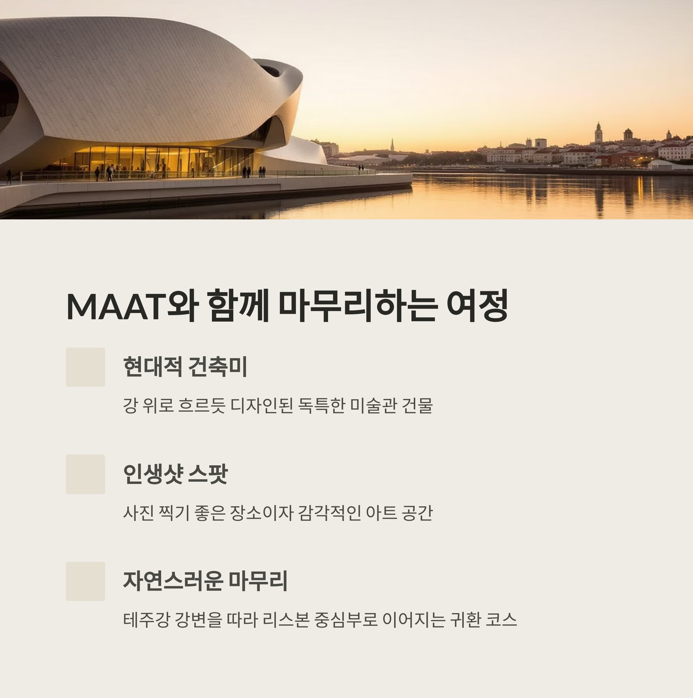| 13:00 | MAAT 외관 | 감각적인 아트 + 귀환 연결 루트 |