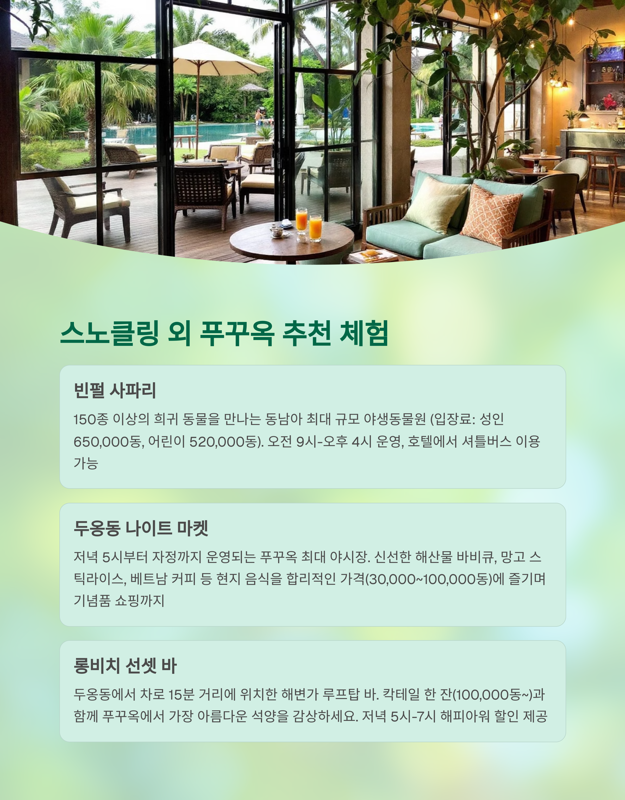 푸꾸옥에서 하루를 보내는 일정 예시는 다음과 같습니다.