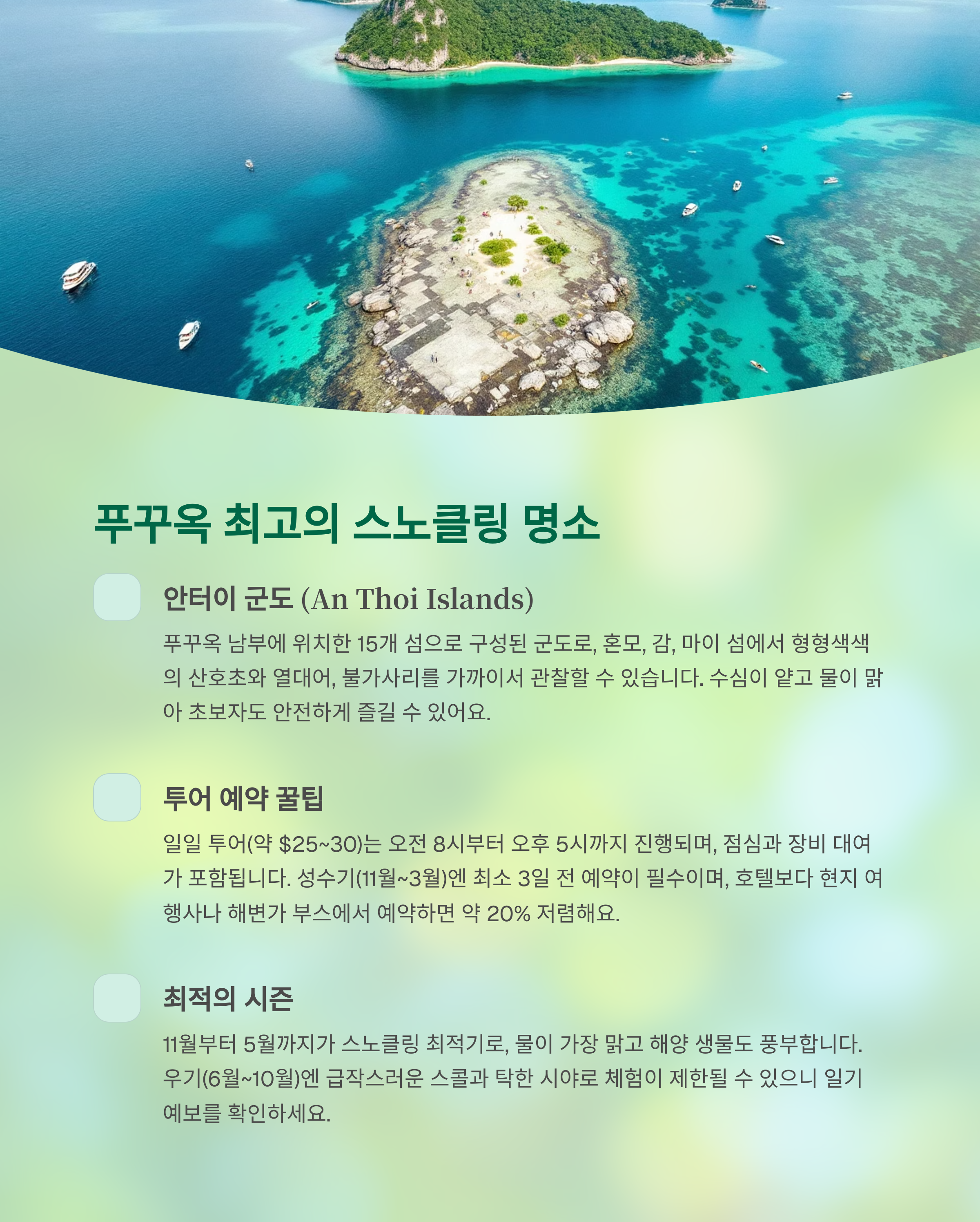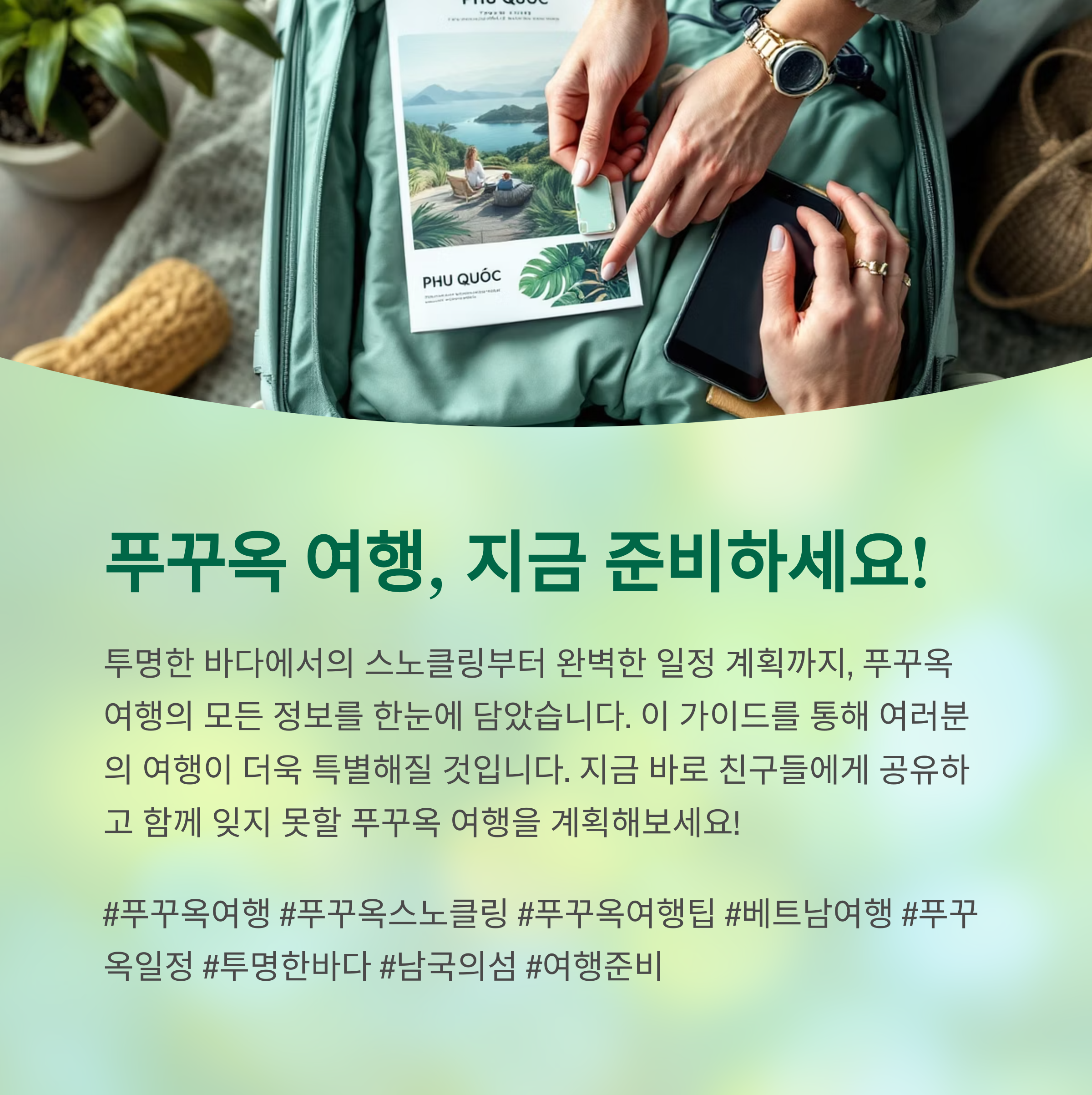 푸꾸옥은 맑고 투명한 바다로 스노클링을 즐기기에 최적의 장소이며, 여행 전 유심 준비와 일정 구성도 중요합니다. 이번 글에서는 푸꾸옥에서 직접 체험한 스노클링 명소, 현지 유심 준비 방법, 그리고 하루 일정을 바탕으로 여행 팁을 공유드릴게요. 알찬 여행을 위해 꼭 챙겨야 할 정보만 담았습니다.