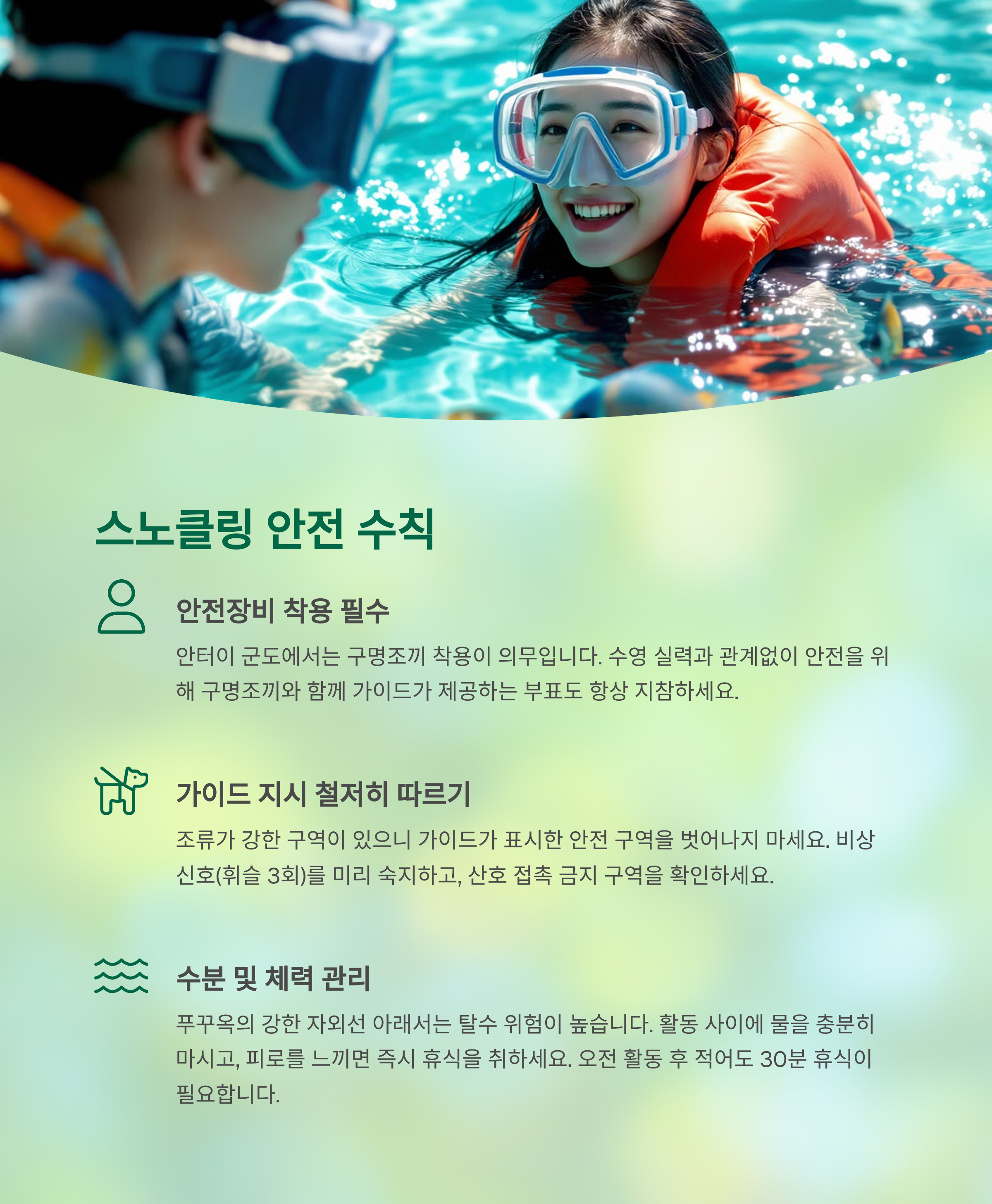 스노클링은 초보자도 쉽게 접근할 수 있지만 안전이 가장 중요합니다.