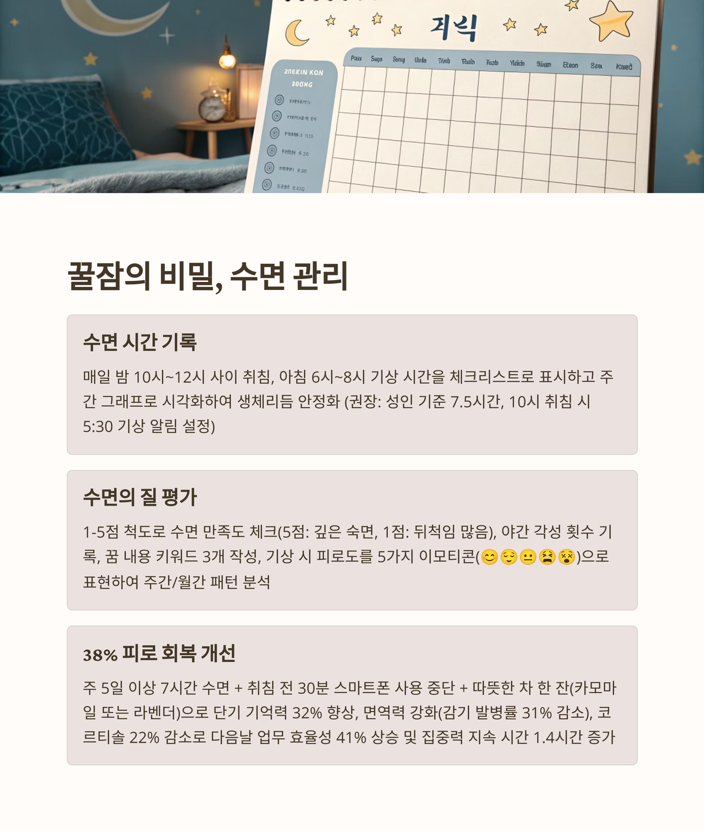 • ✔ 작게 시작하세요: 하루 1~2개 항목만 실천해도 충분합니다.