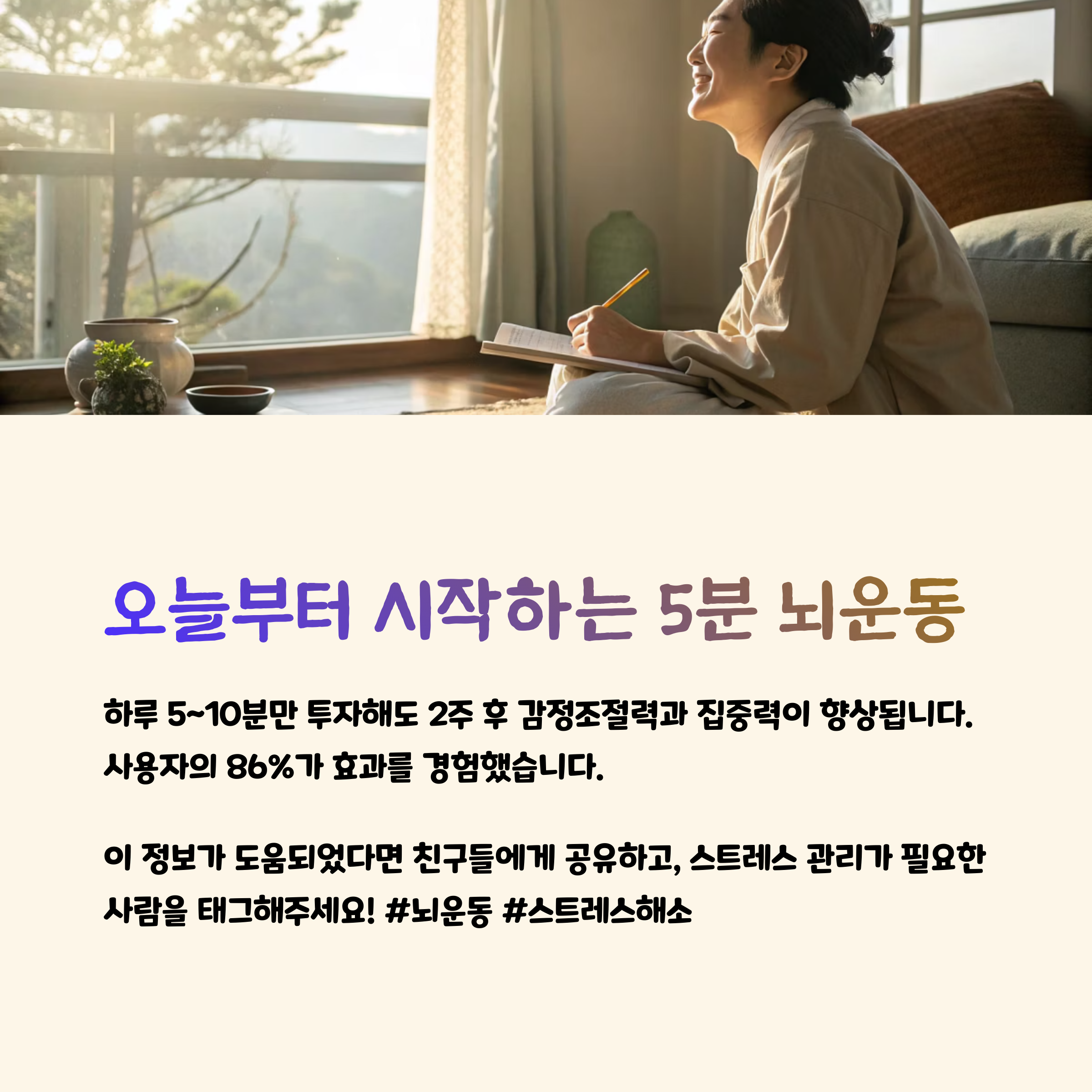 뇌운동은 하루 5~10분만 해도 효과가 나타날 수 있습니다. 특히 자기 전 또는 아침 집중이 안 될 때 실천하면 감정 정돈 + 뇌 활성화를 동시에 잡을 수 있어요. 스마트폰 대신, 오늘은 내 뇌를 위한 시간을 선물해보세요.