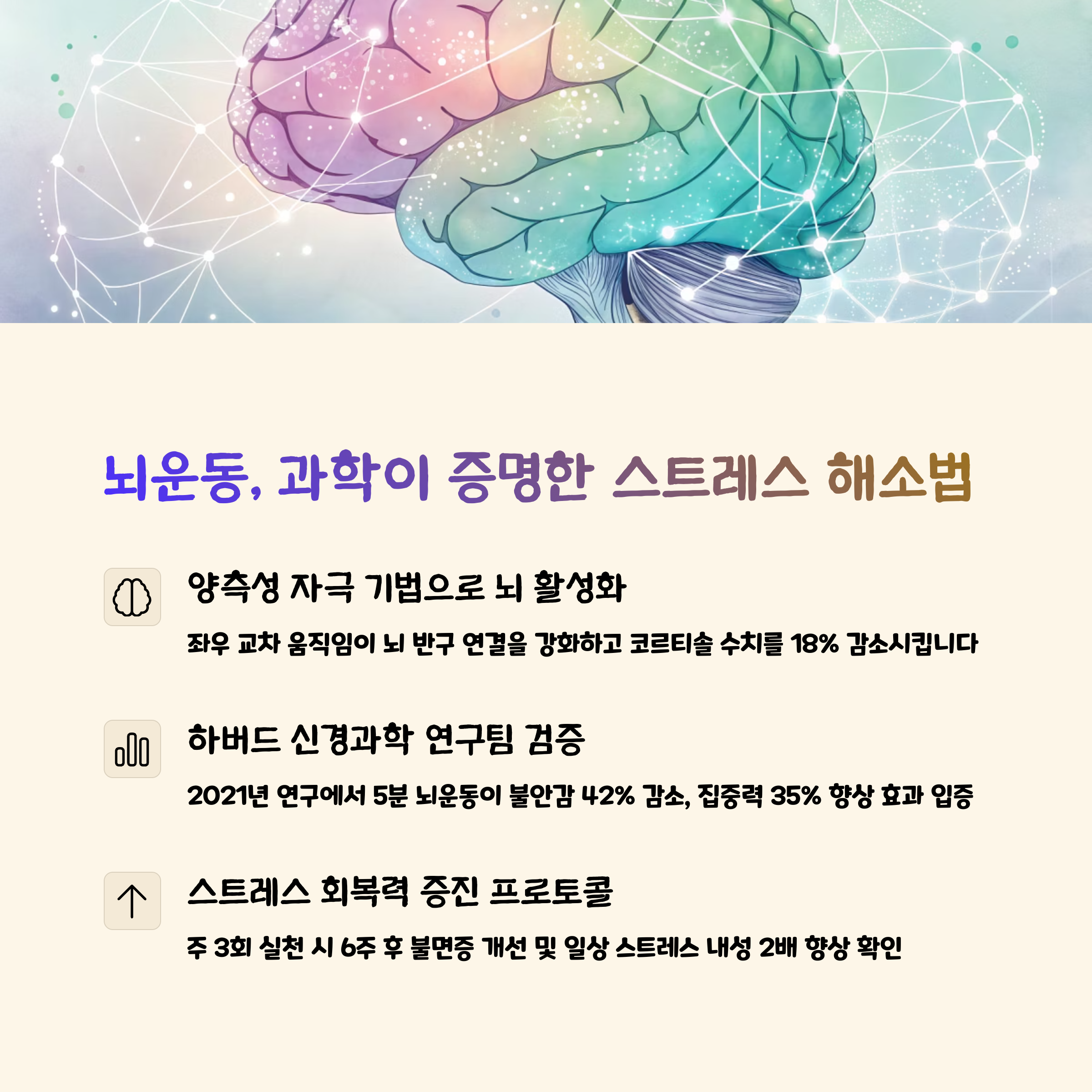 스트레스가 쌓이면 단순히 기분만 나빠지는 것이 아닙니다. 뇌의 감정 조절 기능이 약해지고, 수면의 질, 집중력, 사고 유연성까지 모두 떨어지게 됩니다. 이때 필요한 것은 뇌를 직접 자극해주는 루틴! 규칙적인 뇌운동은 불안정한 뇌파를 안정시키고 감정의 흐름을 차분하게 정리하는 데 큰 도움이 됩니다.