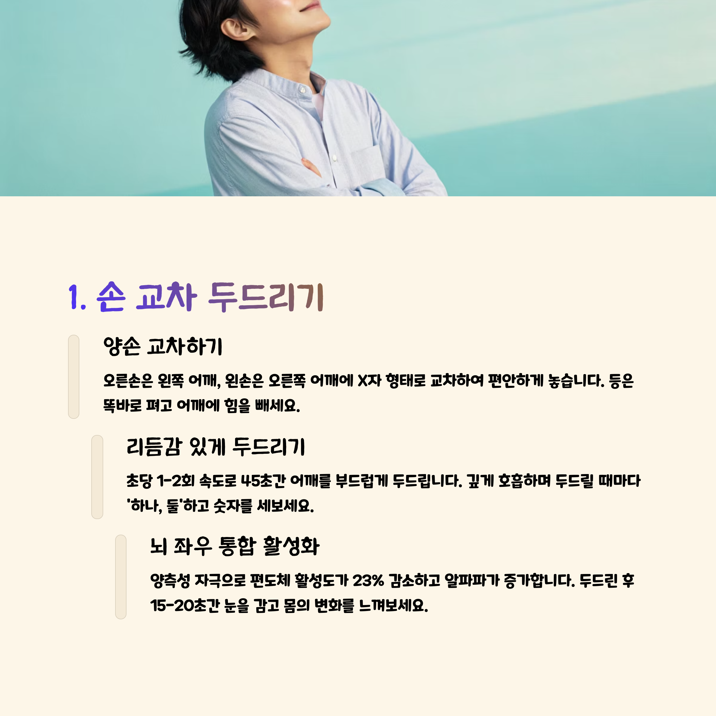 | 스트레스 누적, 집중력 저하, 잠 못 잠 | 손 교차 두드리기, 시선 운동, 호흡 세기 | 감정 안정, 수면 질 개선, 뇌 활성화 |
