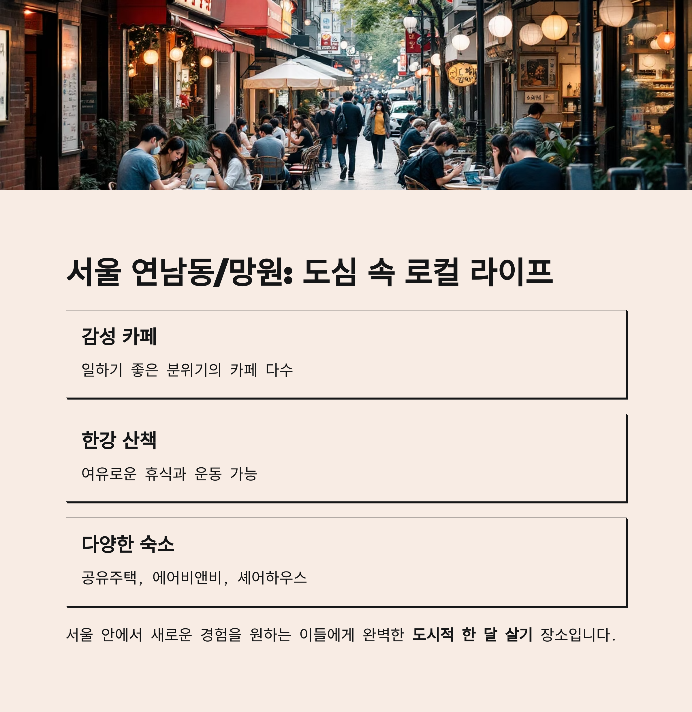 | 서울 연남/망원 | 도심 속 로컬 살기 | 80만~130만 원 | 감성카페+한강산책 |