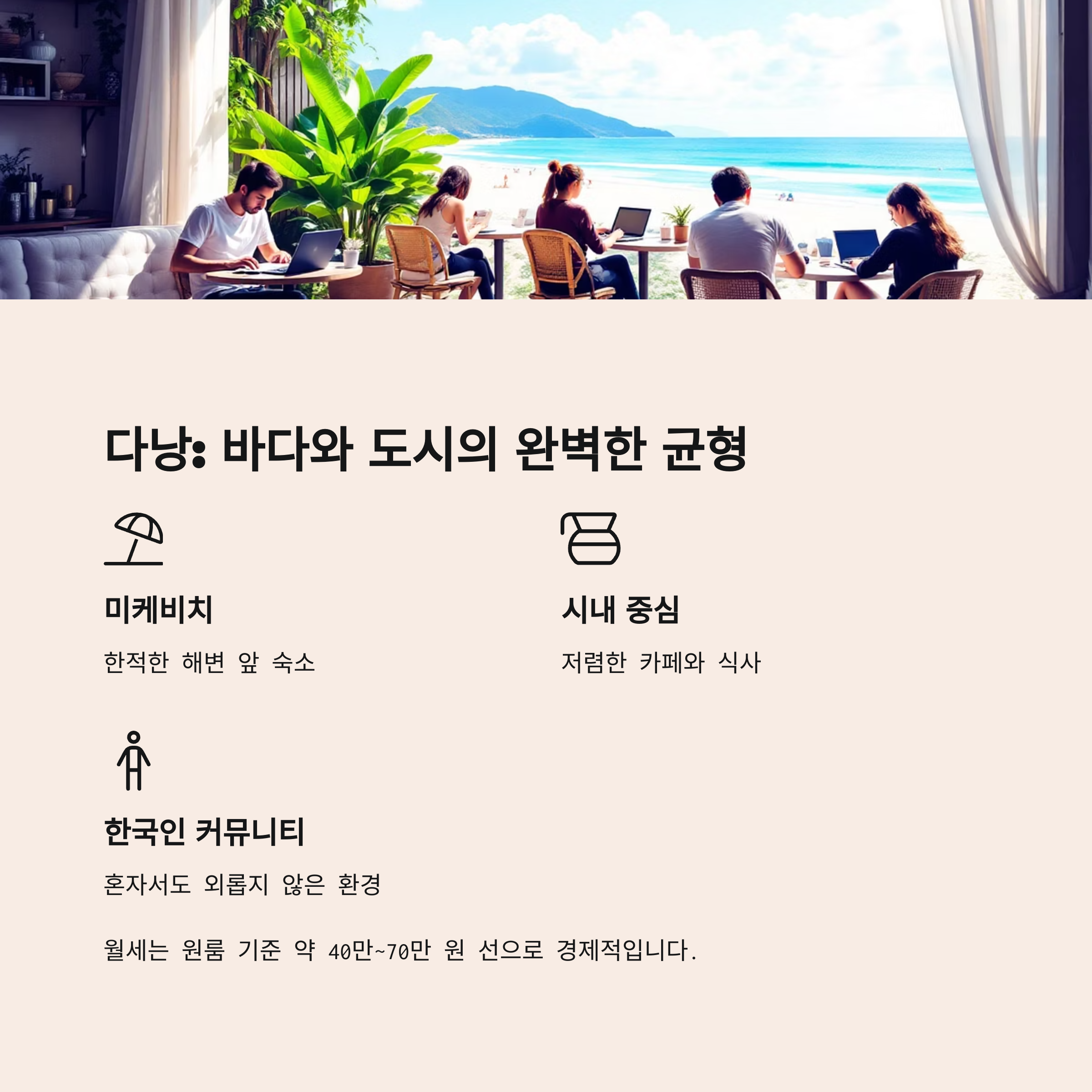| 다낭 | 해변과 도시의 조화 | 40만~70만 원 | 한국인 커뮤니티 |