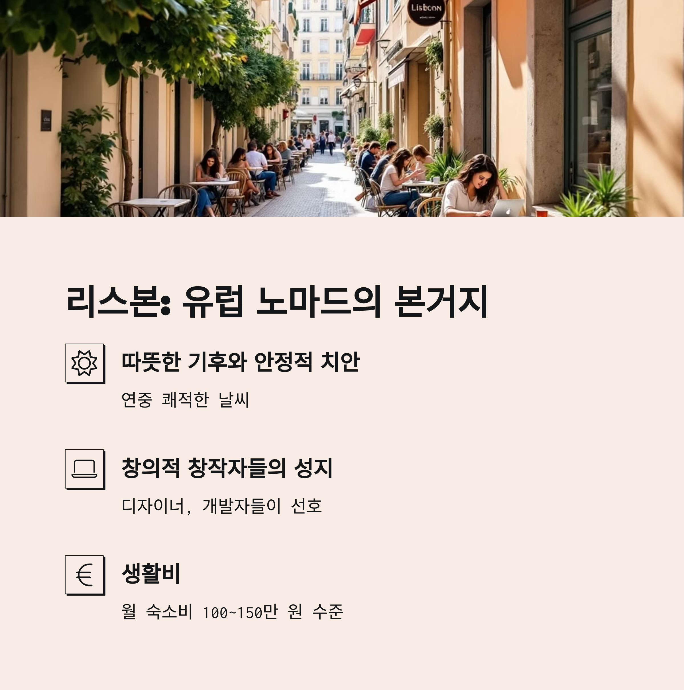 | 리스본 | 유럽 감성+노마드 중심 | 100만~150만 원 | 코워킹+라이프스타일 |