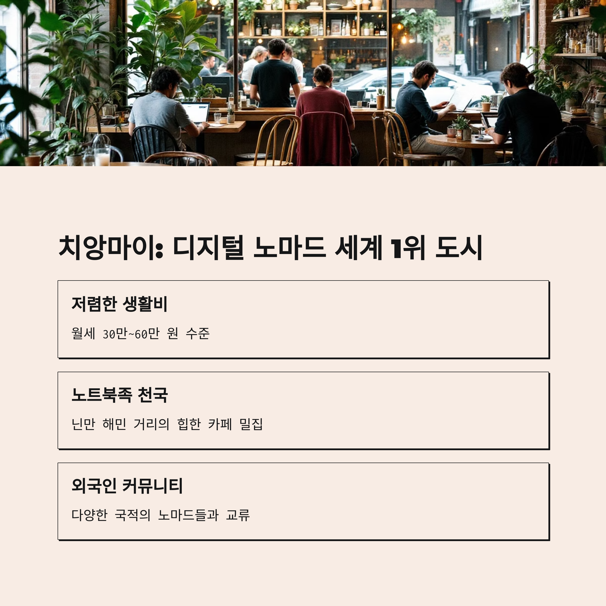 숙소 비용, 인터넷 환경, 카페/워크플레이스, 현지 분위기까지 모두 고려해