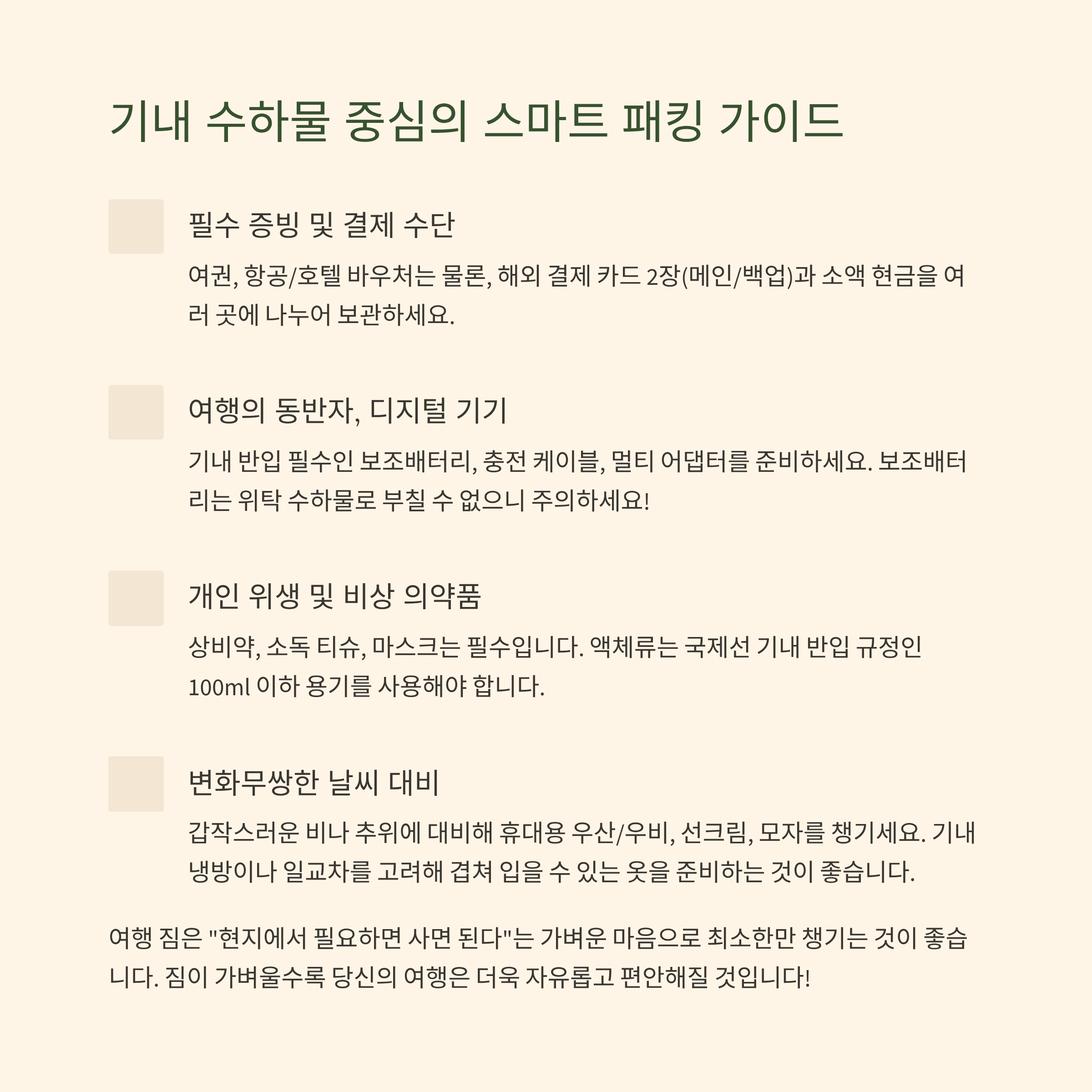 | 우천/햇빛 | 미니 우산·우비, 선크림, 모자 | 돌발 날씨 대비 |