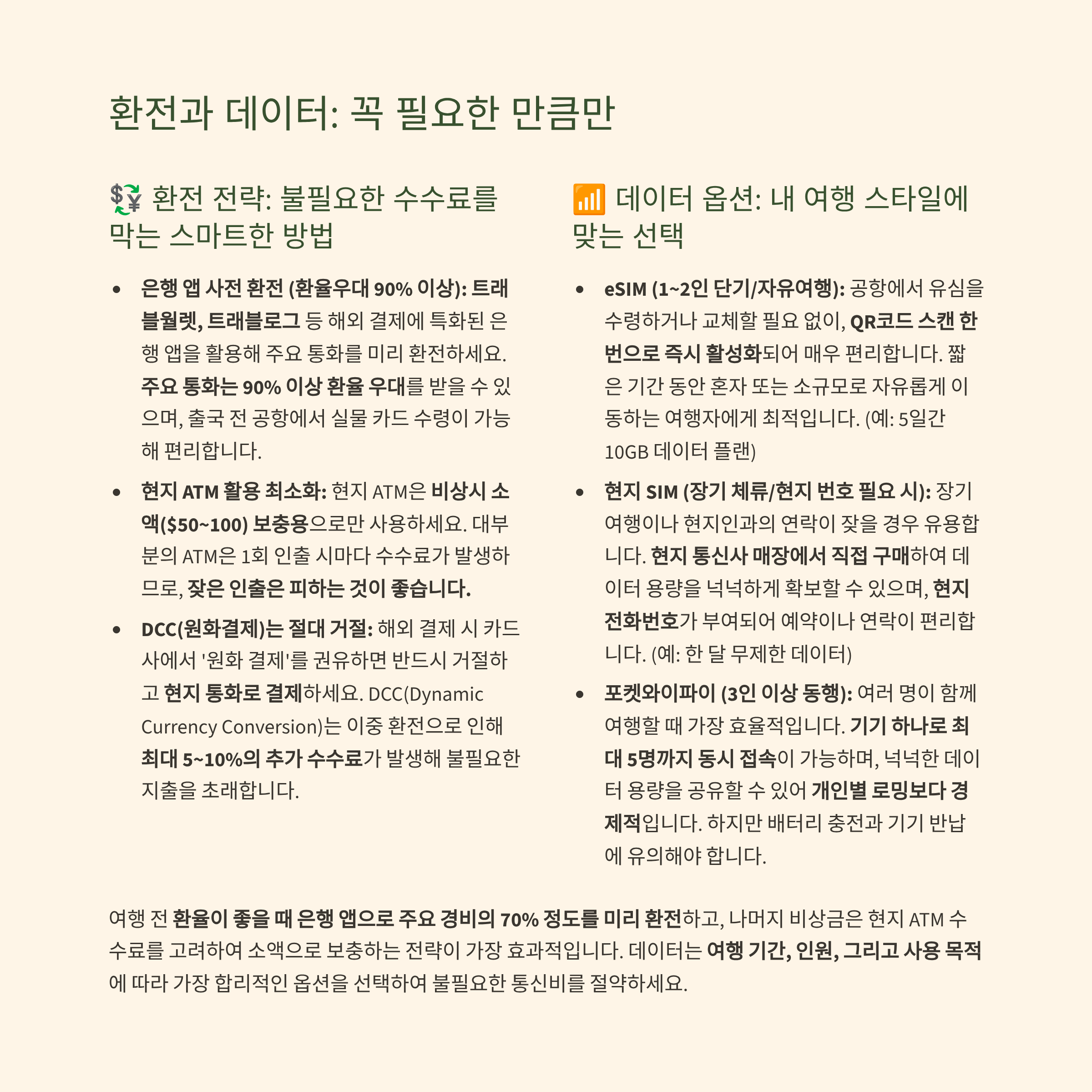 A. 소액 현금만 환전하고, 결제는 해외수수료 낮은 카드로 현지통화 결제를 권장합니다.