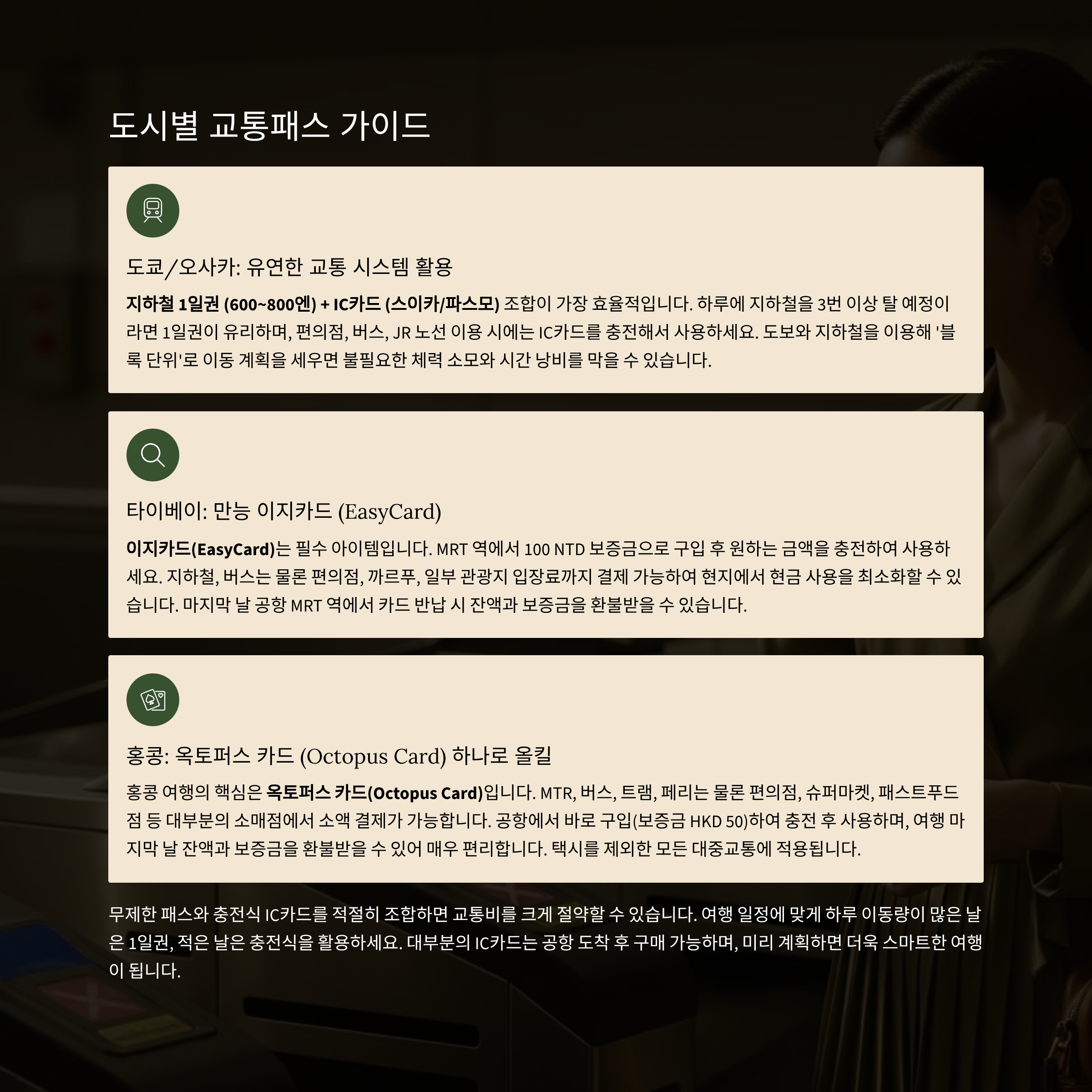 | 타이베이 | 이지카드(EasyCard) | 충전식, 편의점 연동 |