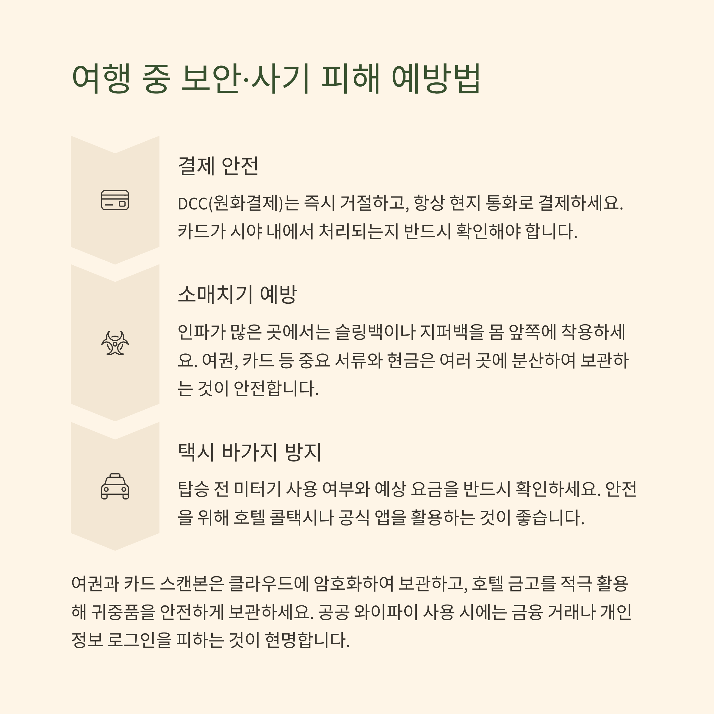 여권/카드 스캔본은 클라우드에 암호 보관, 호텔 금고 사용. 공공 와이파이에선 금융/로그인 지양.