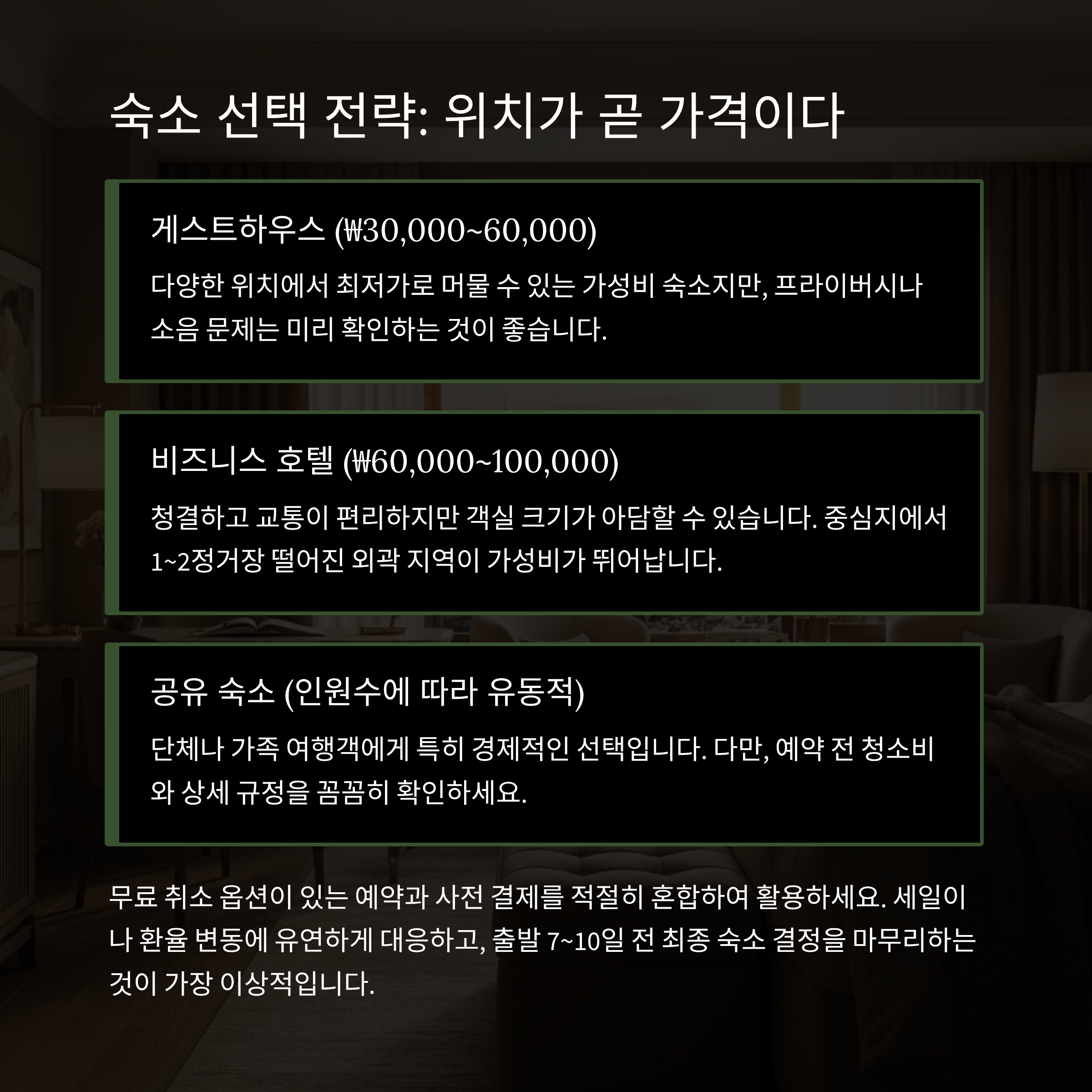 | 게스트하우스 | ₩30,000~60,000 | 최저가/위치 다양 | 프라이버시/소음 |