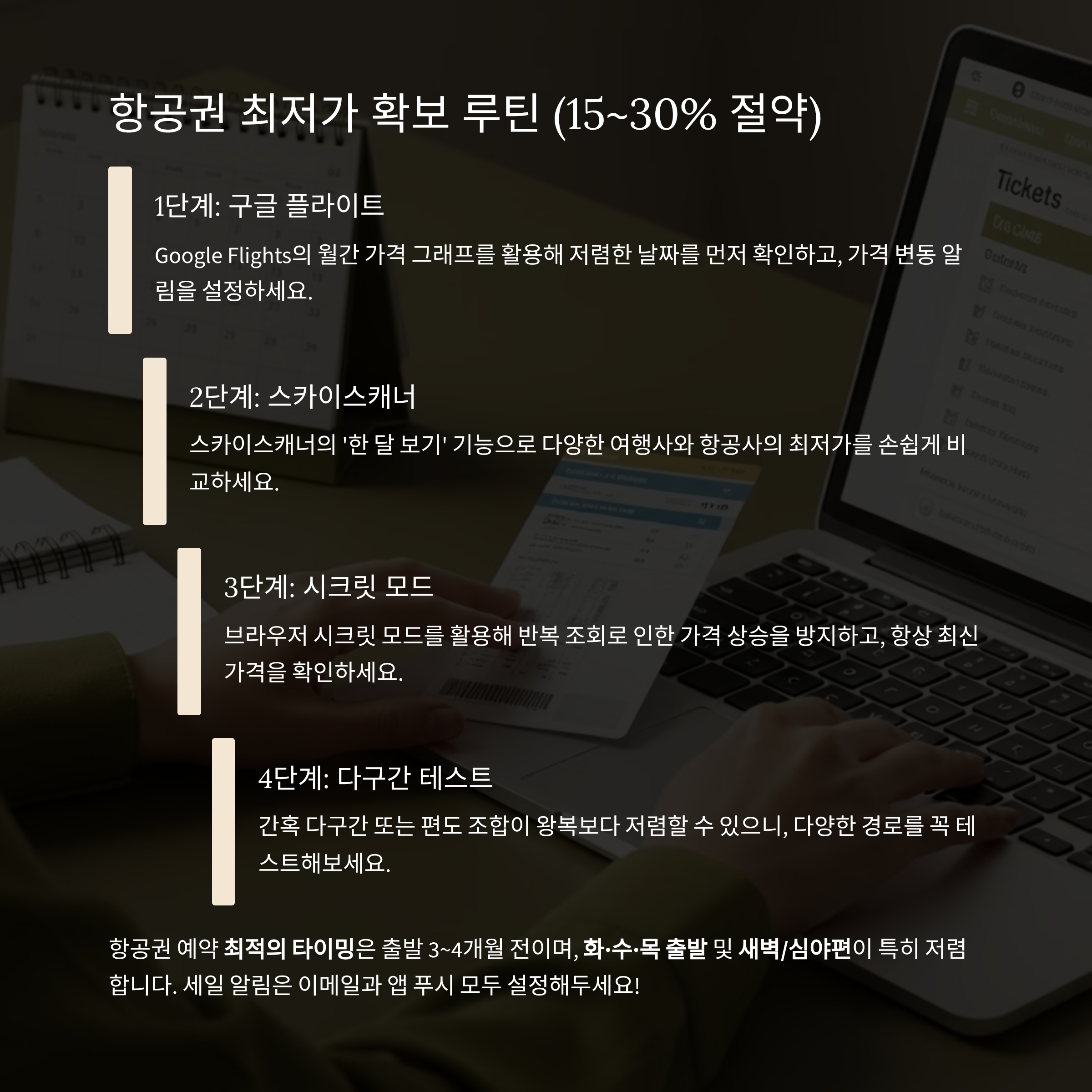 베스트 타이밍: 3~4개월 전, 화·수·목 출발, 새벽/심야편. 세일 알림은 메일·앱 푸시 동시 등록.