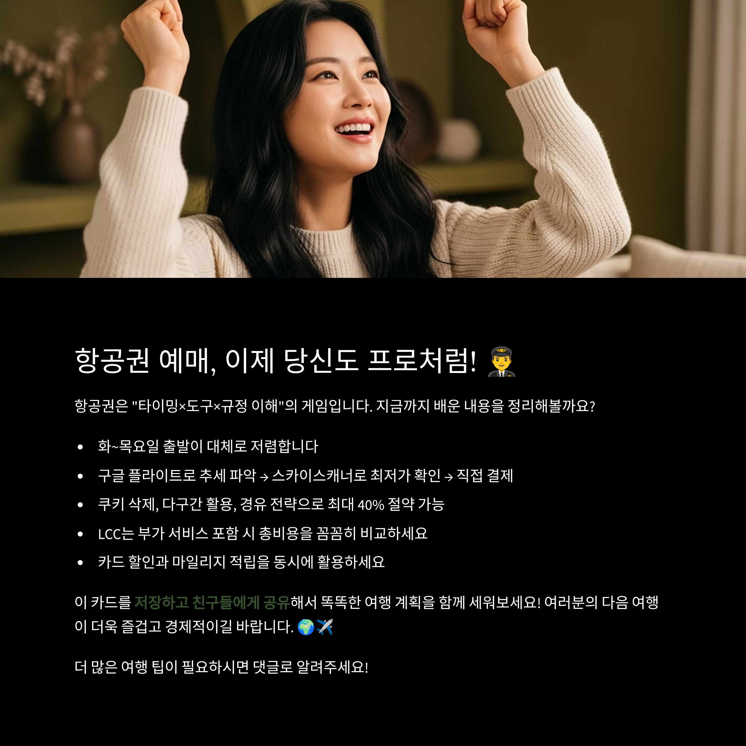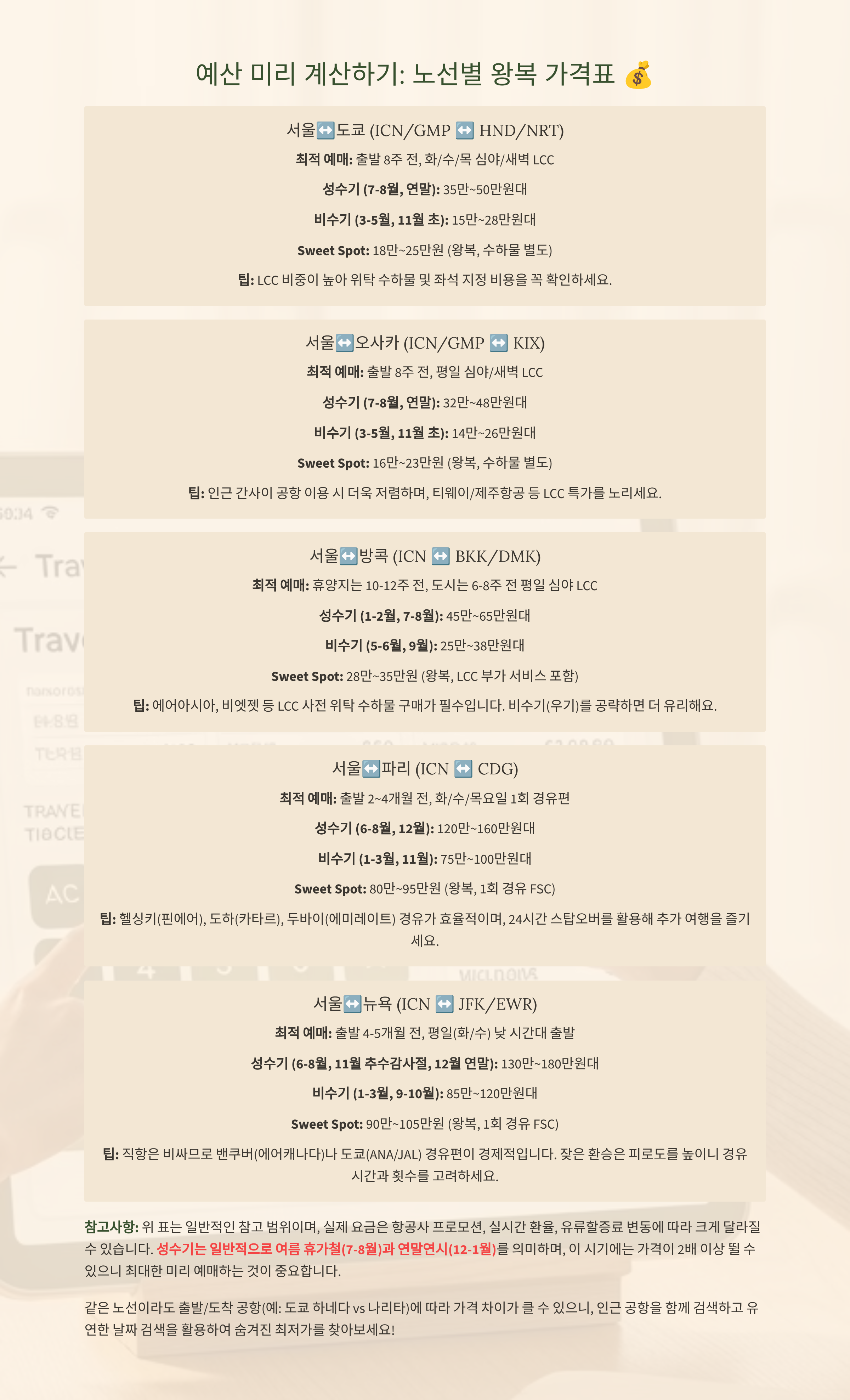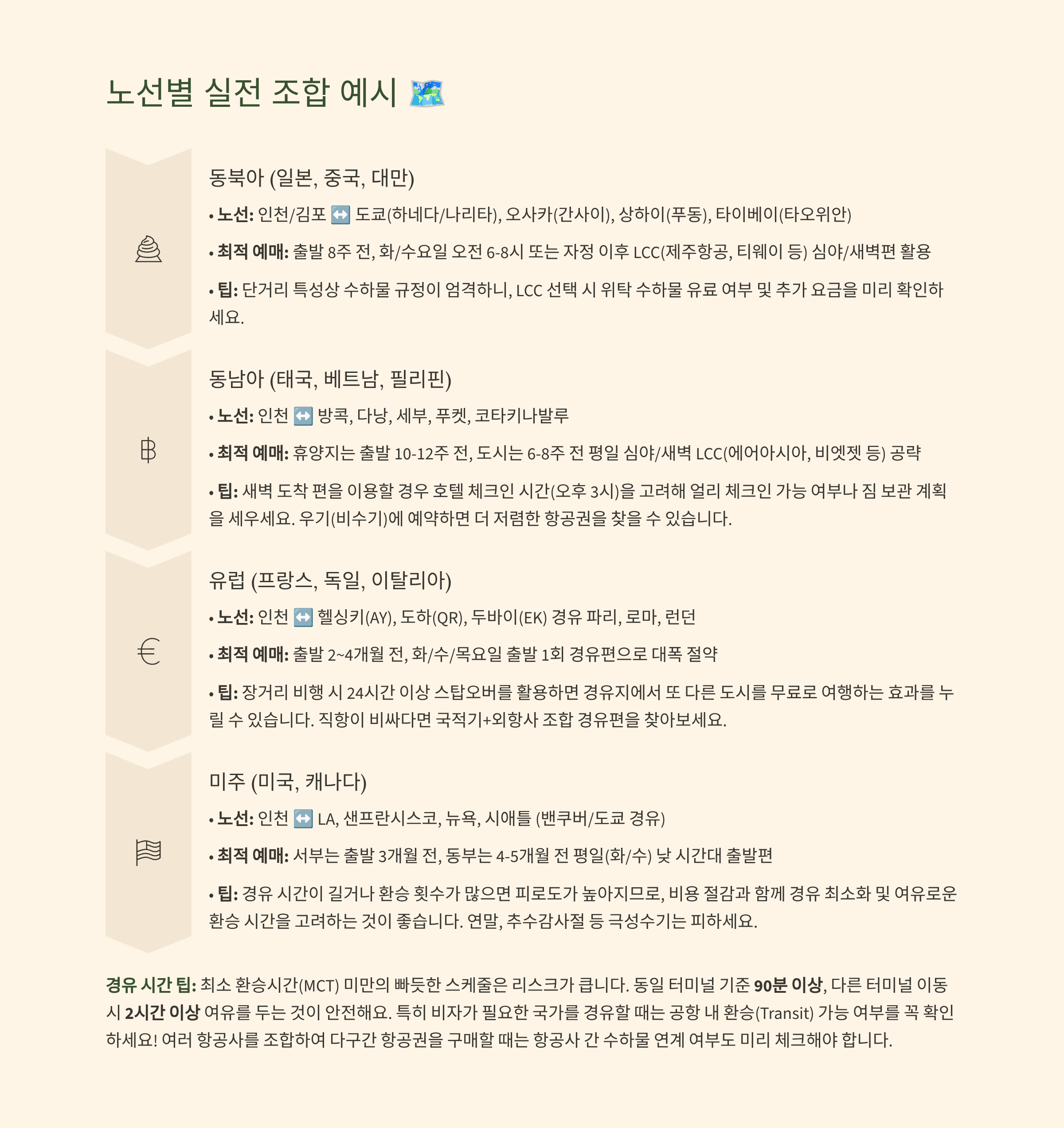 | 동북아(도쿄·오사카·타이베이 등) | 출발 6~10주 전 | 화/수 출발, 이른 아침·심야 | 연휴 전후 피크 주의 |