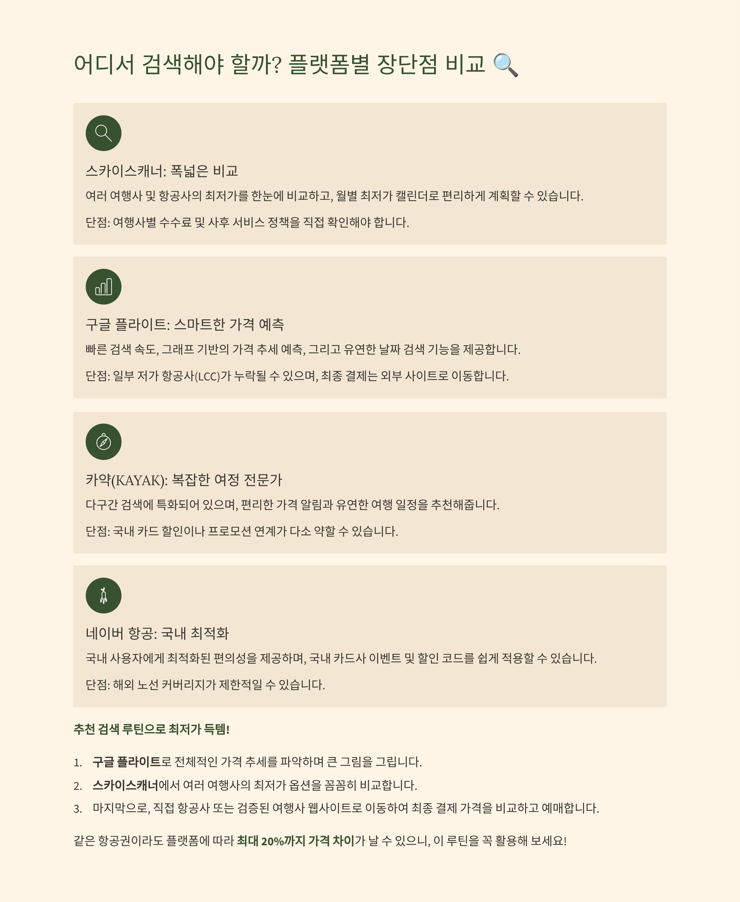 | 네이버 항공 | 국내 사용자 편의, 카드사 이벤트/할인 코드 연계 | 해외 노선 커버리지 제한 |