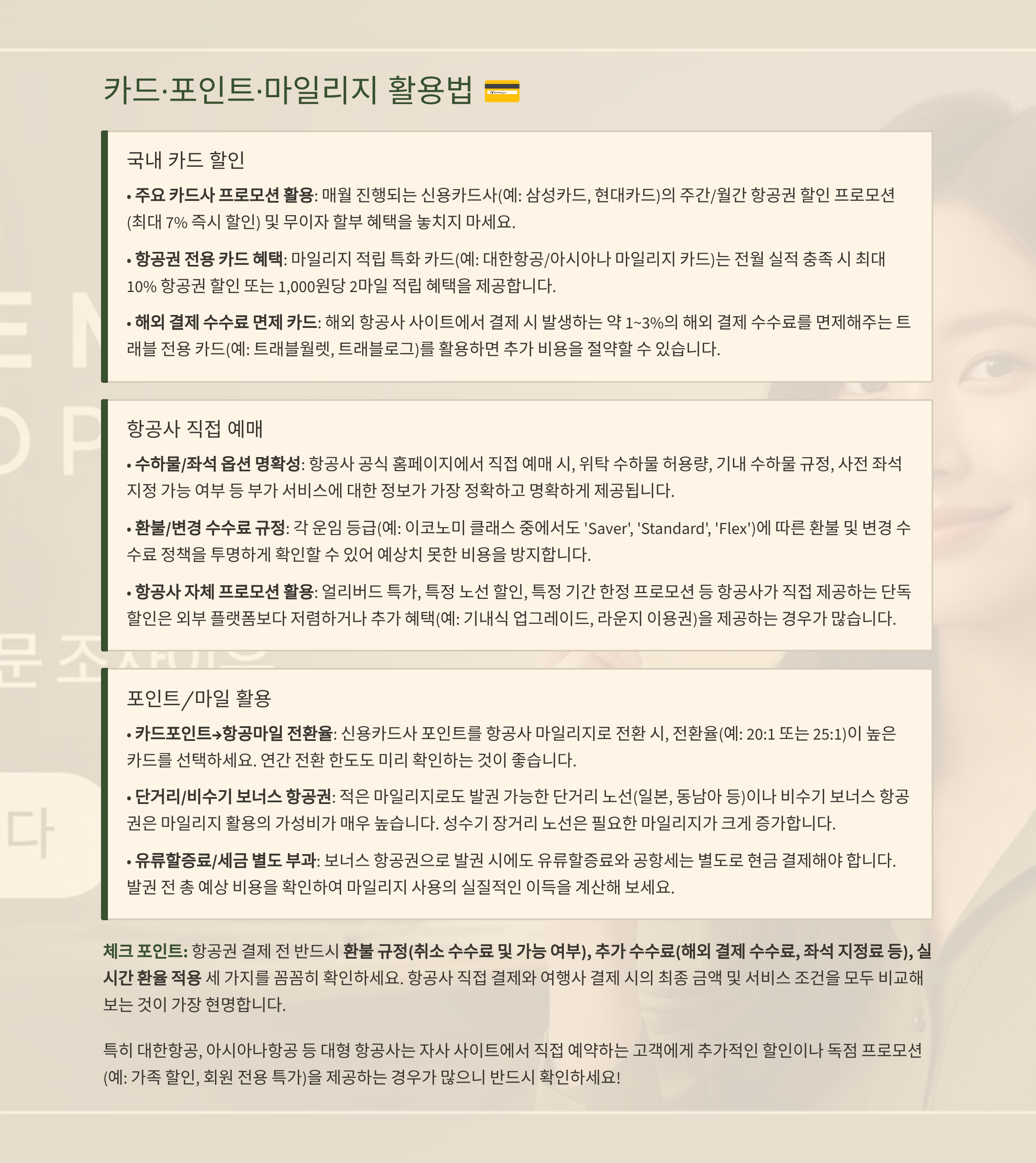 | 국내 카드 할인 | 카드사 주간 프로모션/코드 입력 | 해외 결제 수수료·부분취소 불가 여부 |