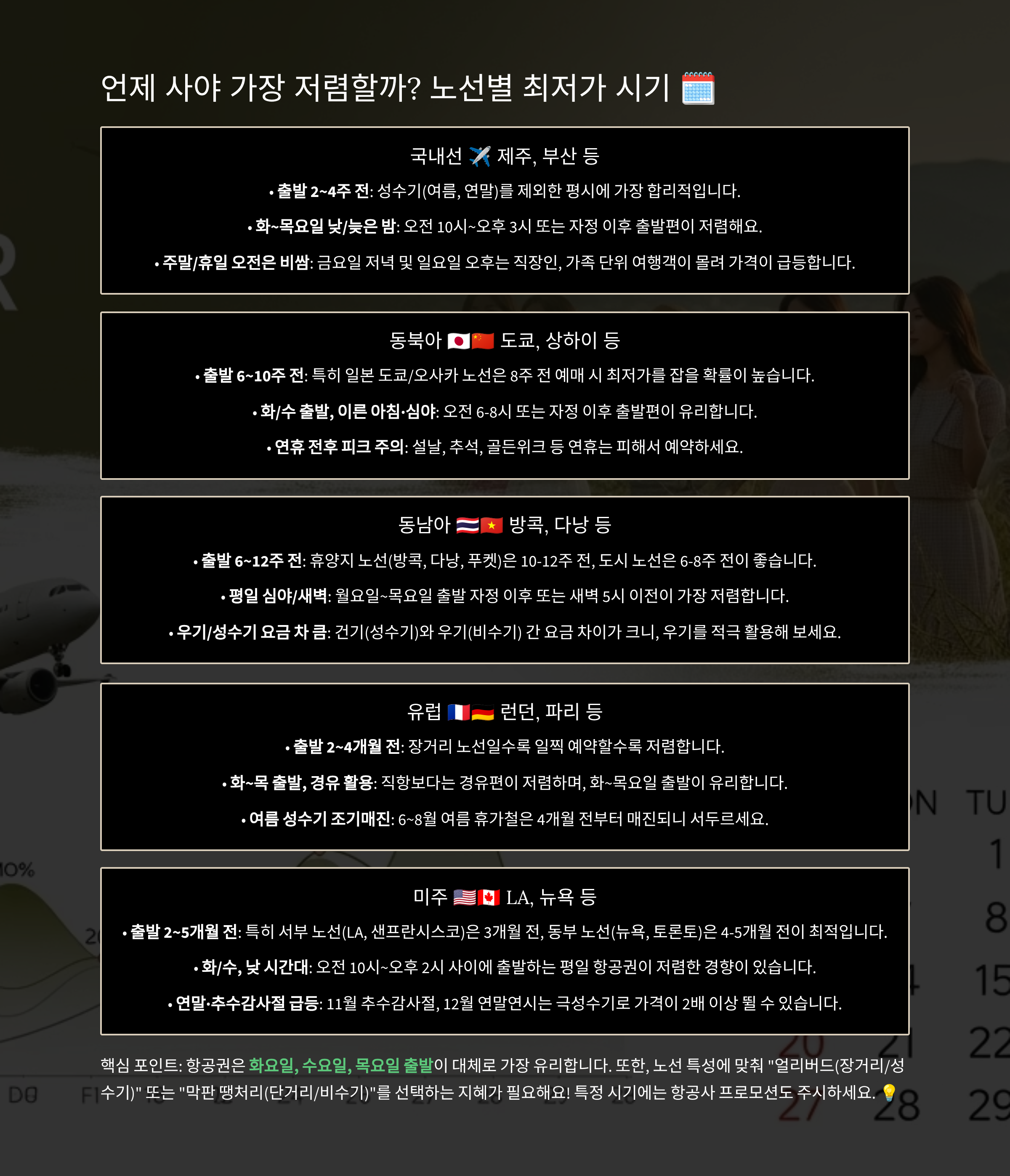| 미주 | 출발 2~5개월 전 | 화/수, 낮 시간대 | 연말·추수감사절 급등 |