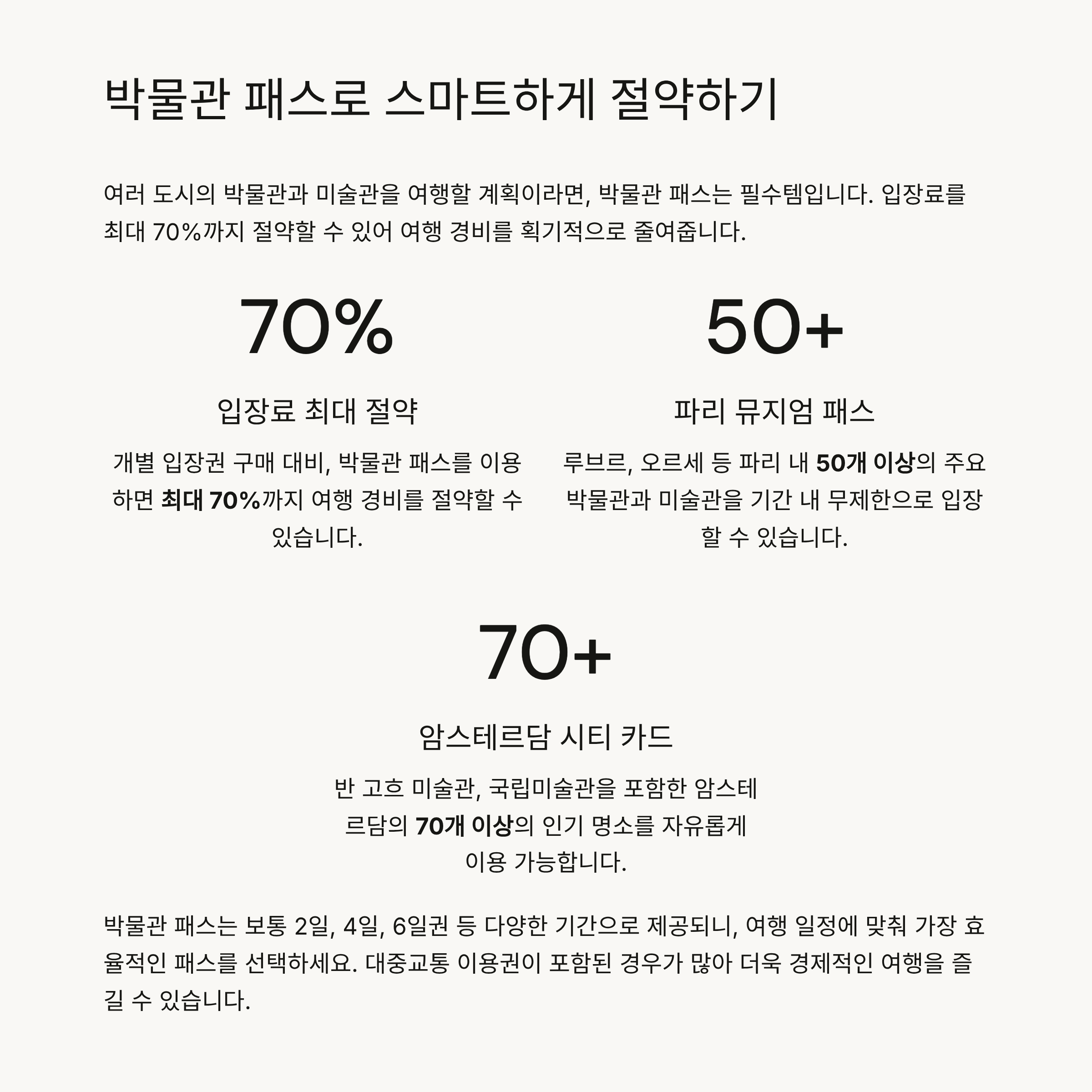 | 파리 뮤지엄 패스 | 파리 | 50곳 이상 |