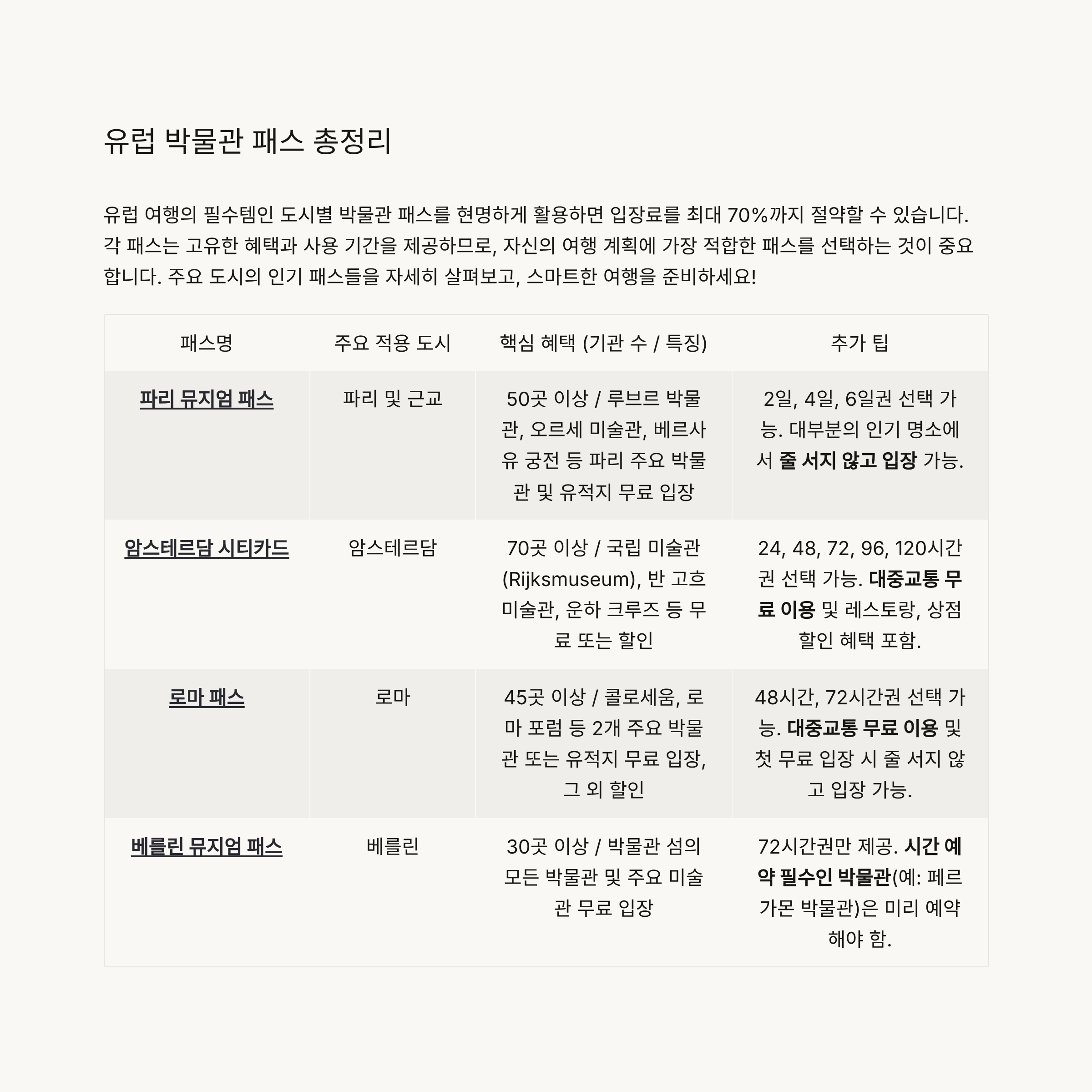 유럽에서는 패스를 잘 활용하면 입장료를 최대 70%까지 아낄 수 있어요. 도시별로 맞는 패스를 꼭 선택해보세요.