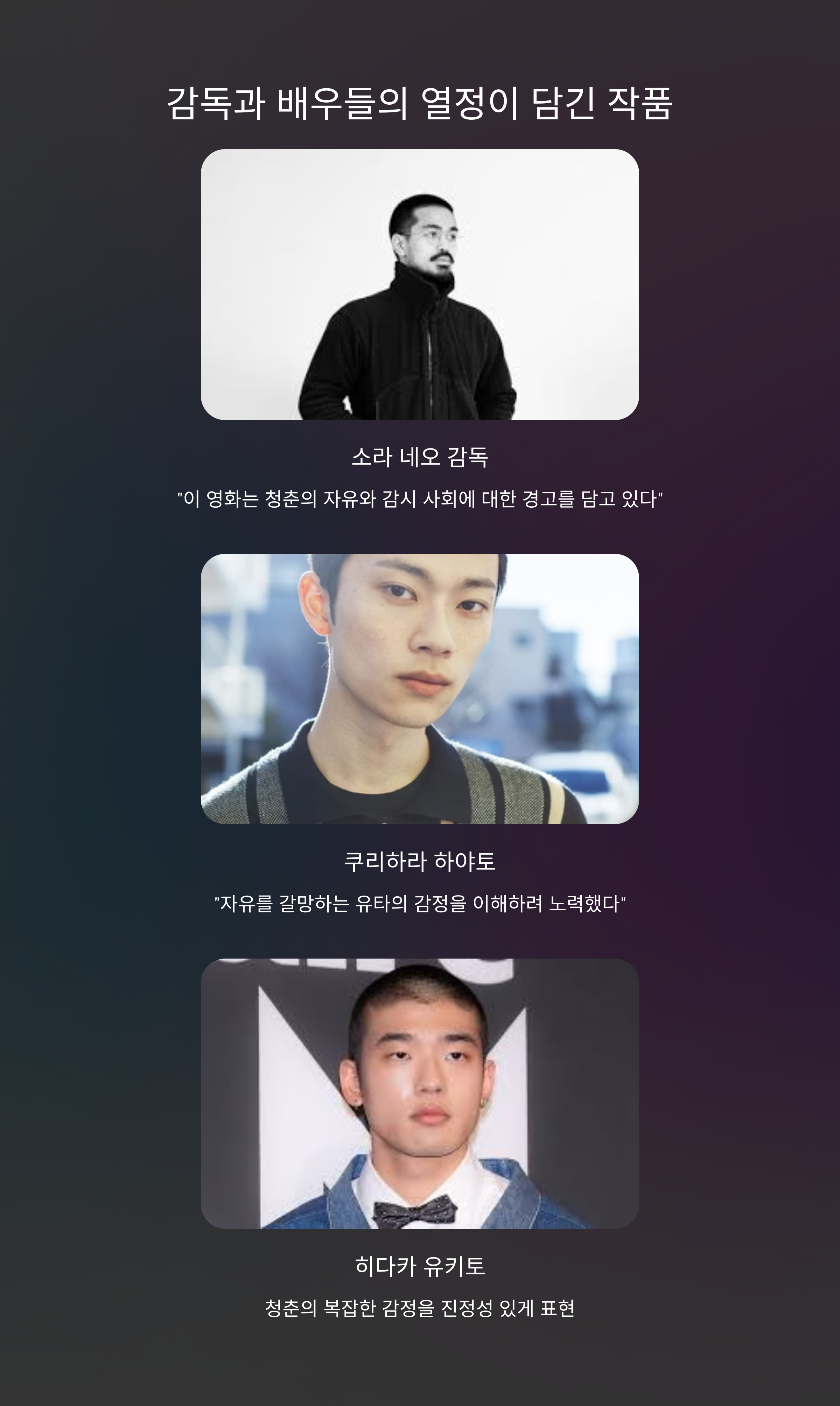 감독은 "이 영화는 청춘의 자유와 감시 사회에 대한 경고를 담고 있다"고 말했어요.