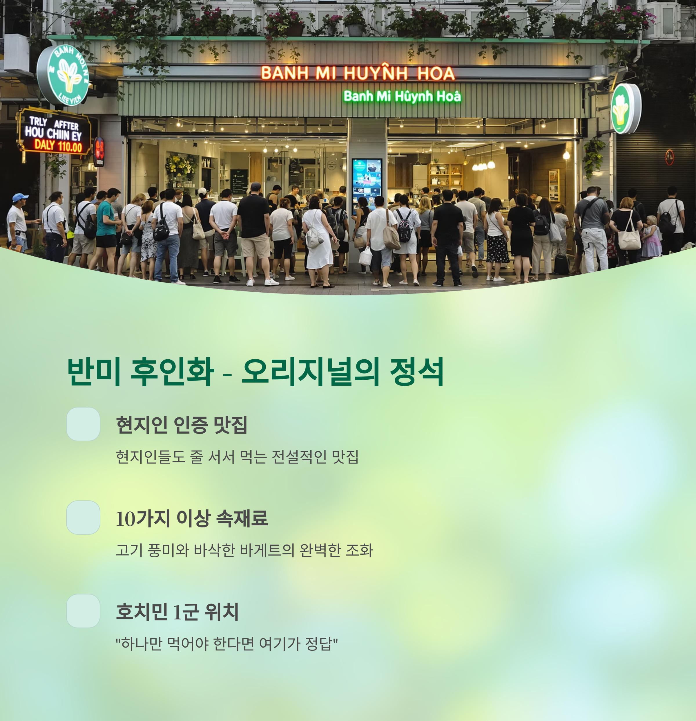 | 1위 | 반미 후인화 | 고기종합 반미 | 현지인 1순위, 재료 다양 |