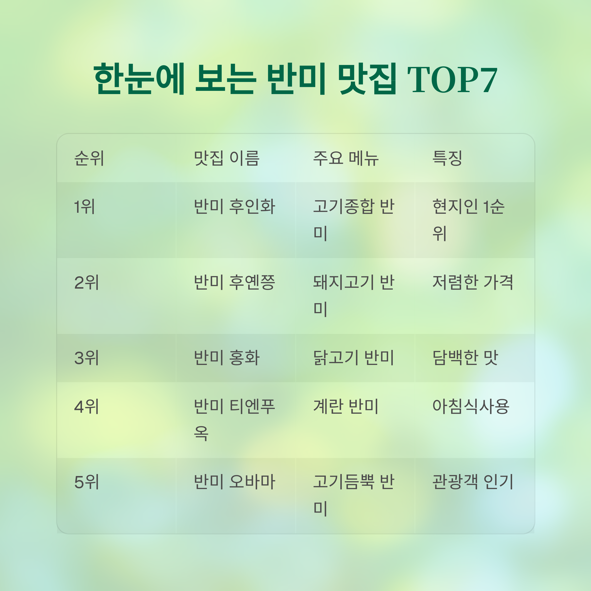 | 5위 | 반미 오바마 | 고기듬뿍 반미 | 관광객 인기 |
