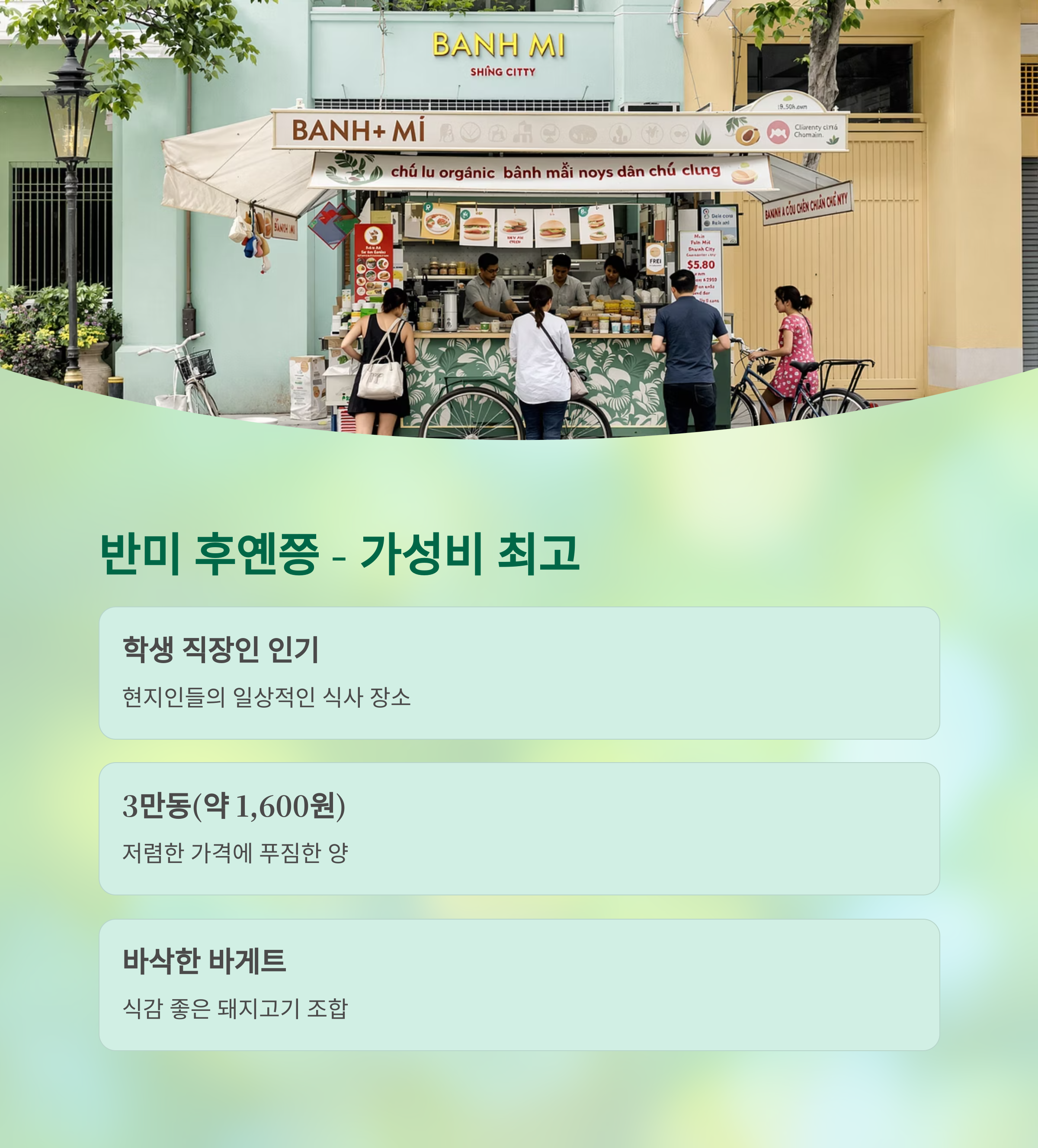 | 2위 | 반미 후옌쯩 | 돼지고기 반미 | 저렴한 가격, 학생 인기 |
