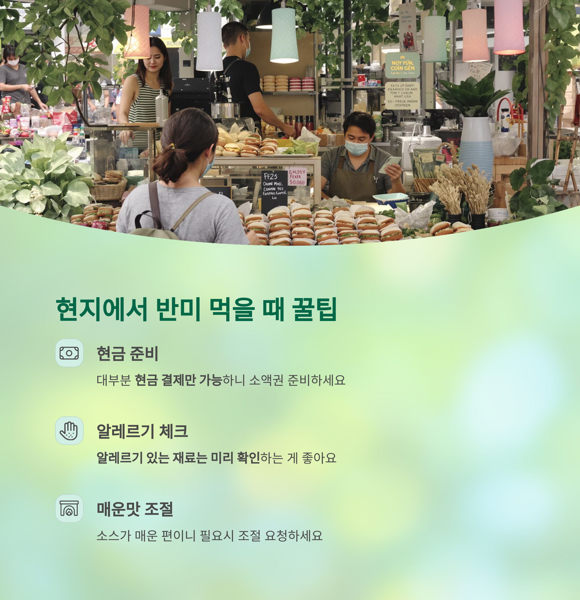- 반미는 대부분 현금 결제만 가능하니 소액 동전이나 지폐를 준비하세요.