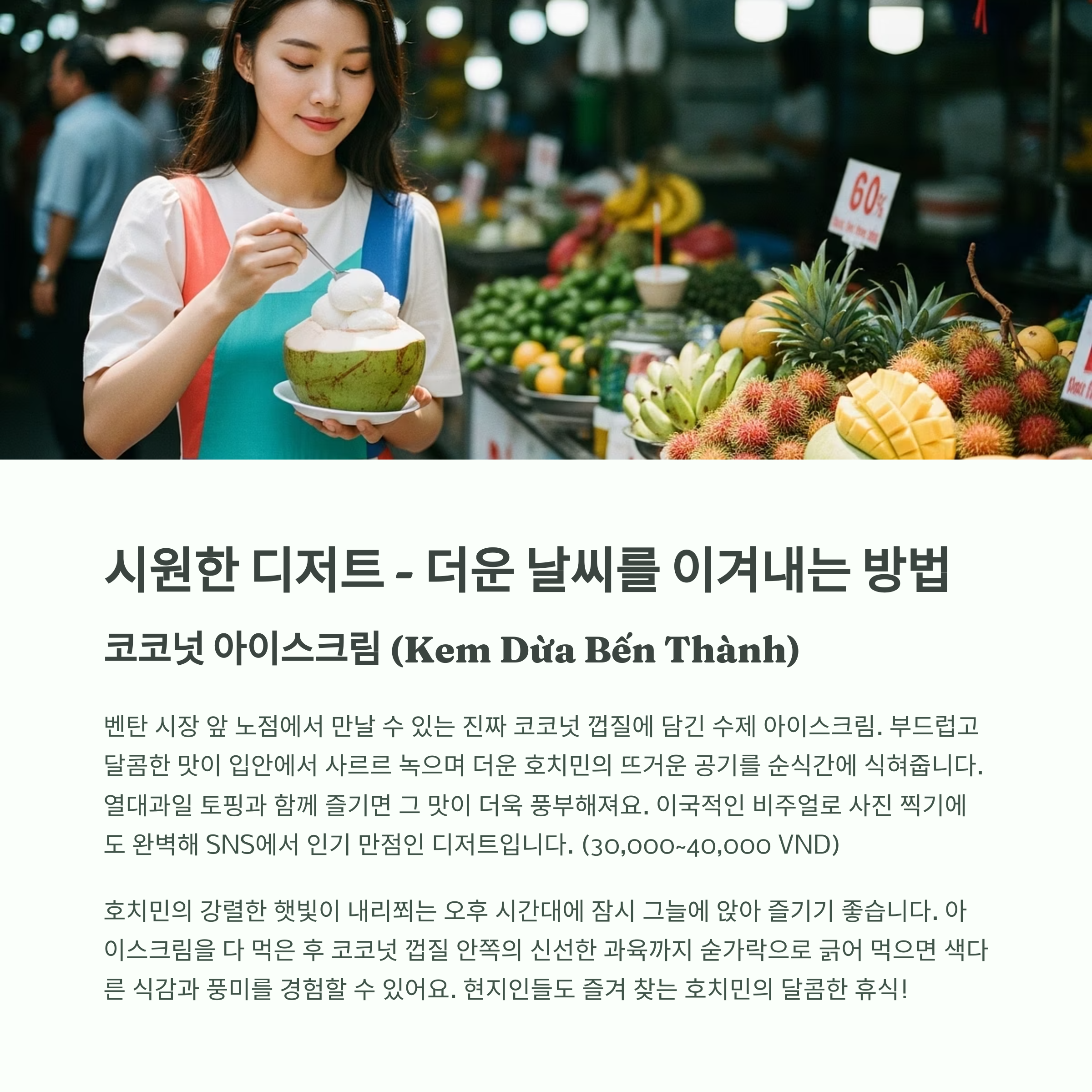 | 코코넛아이스크림 | 30,000 VND | 벤탄시장 노점 |