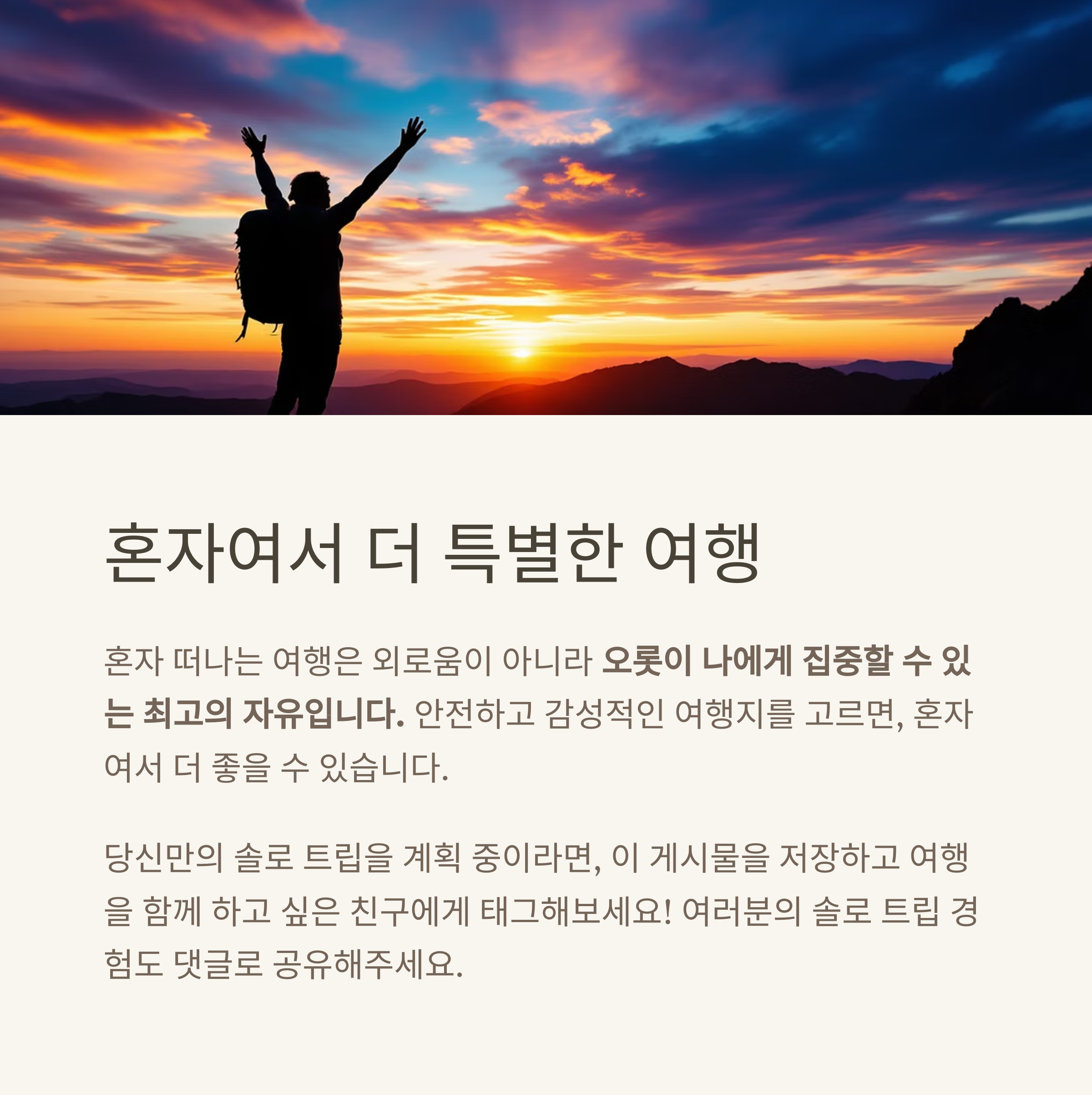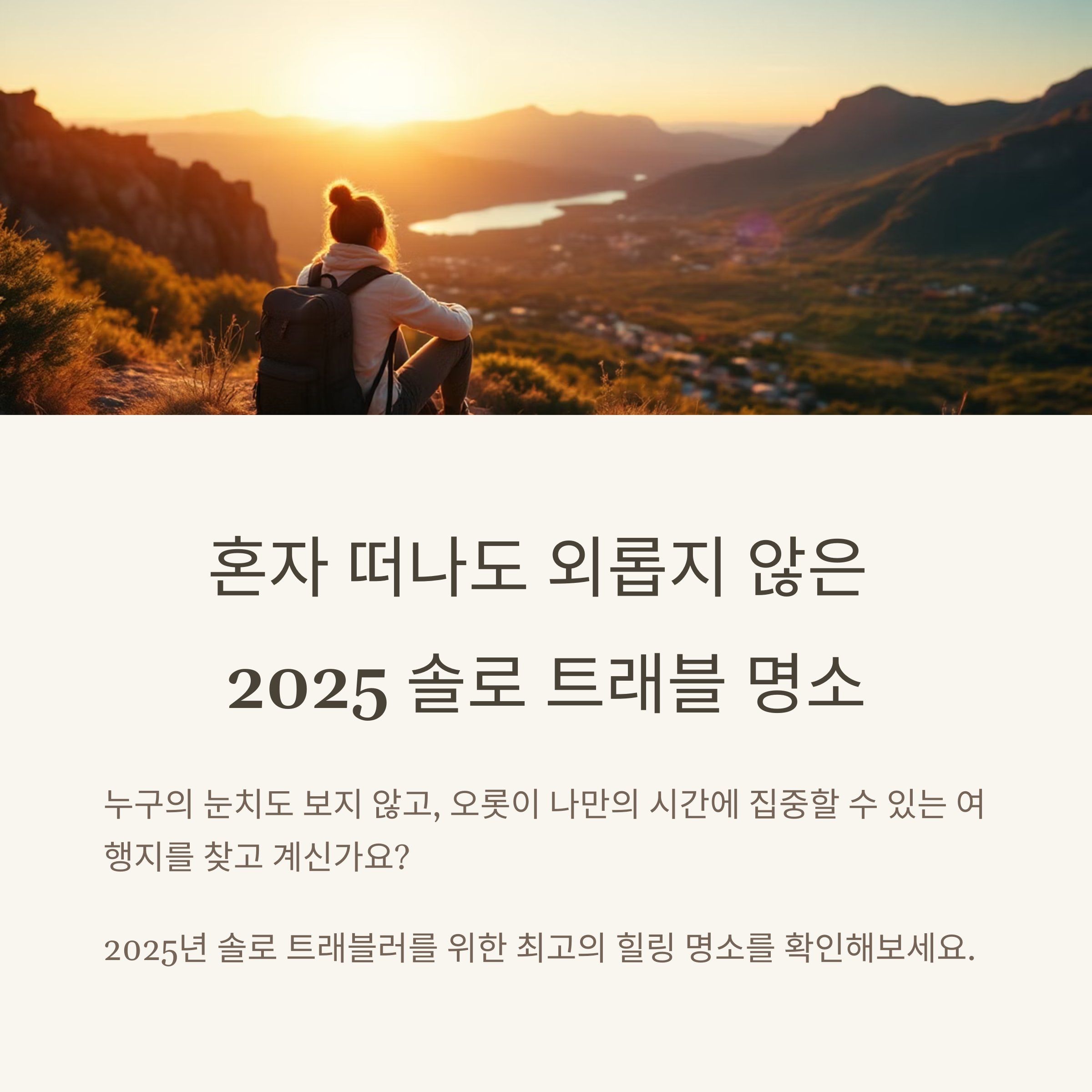 혼자 떠나는 여행은 외로움이 아니라 오롯이 나에게 집중할 수 있는 최고의 자유입니다. 안전하고 감성적인 여행지를 고르면, 혼자여서 더 좋을 수 있습니다.