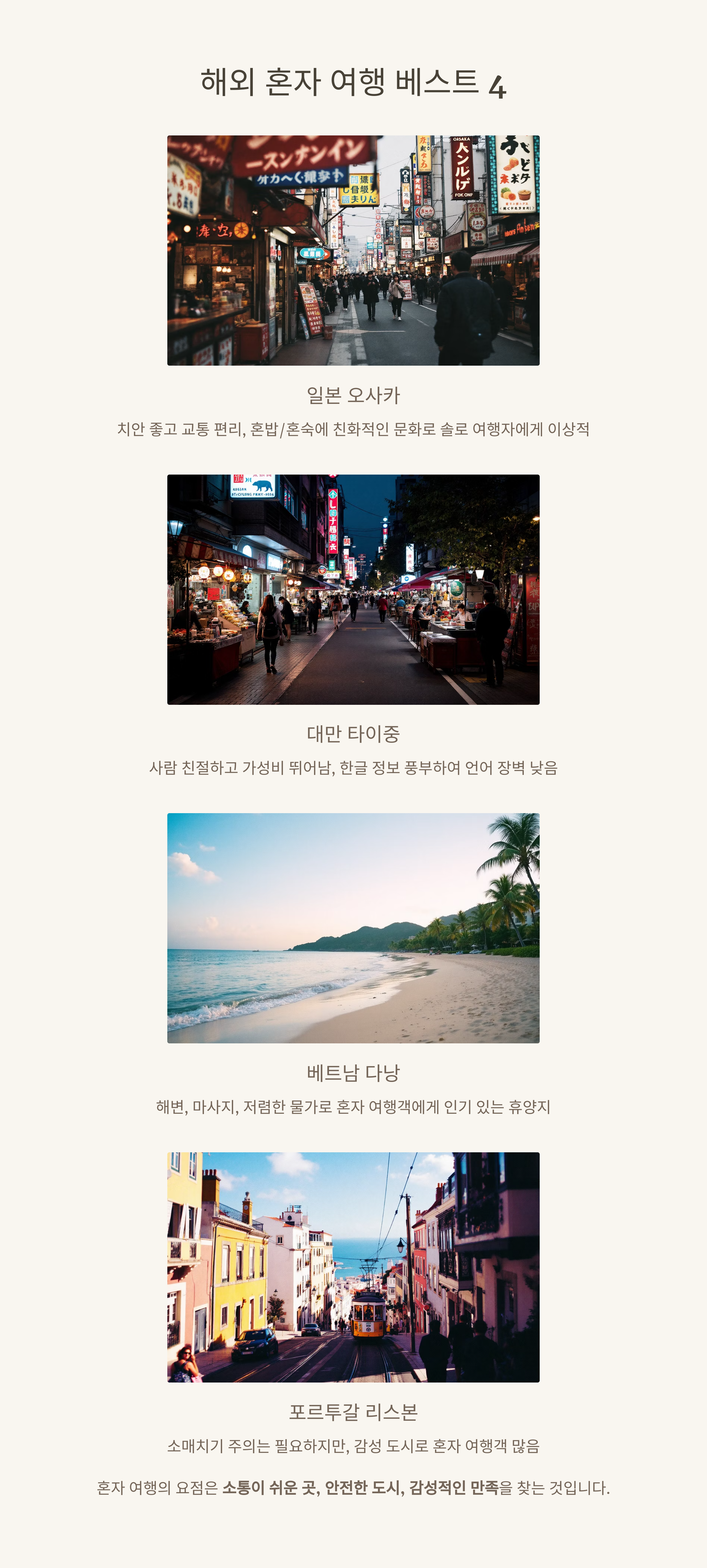 "혼자 여행의 핵심은 소통이 쉬운 나라, 안전한 도시, 감성적 만족감이 높은 곳을 고르는 것."