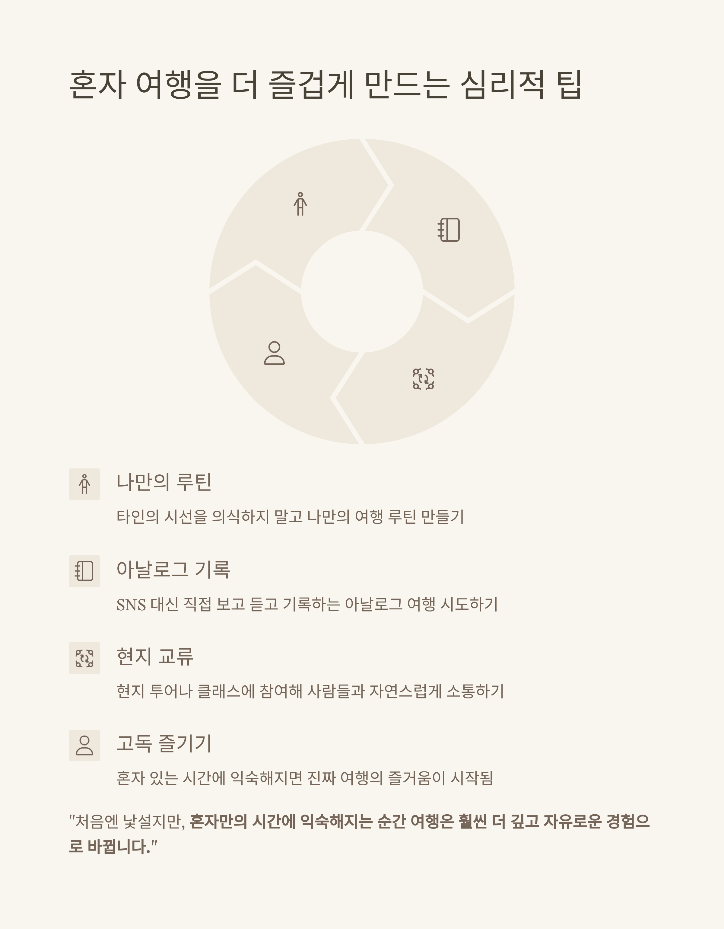 - 혼자 있는 시간에도 익숙해지면 진짜 여행의 즐거움이 시작됨