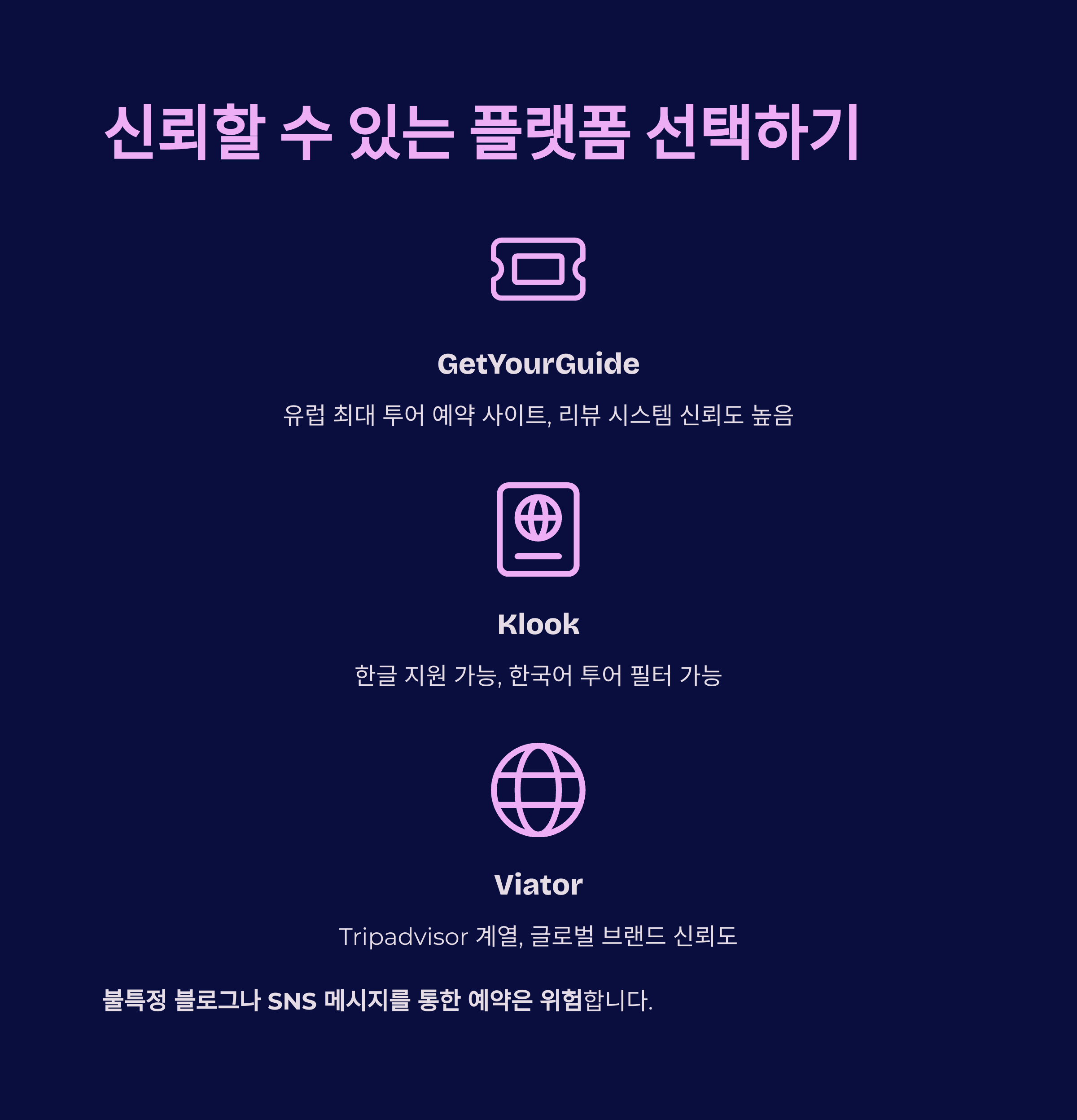 | GetYourGuide | 유럽 최대 투어 예약 사이트, 리뷰 시스템 신뢰도 높음 |
