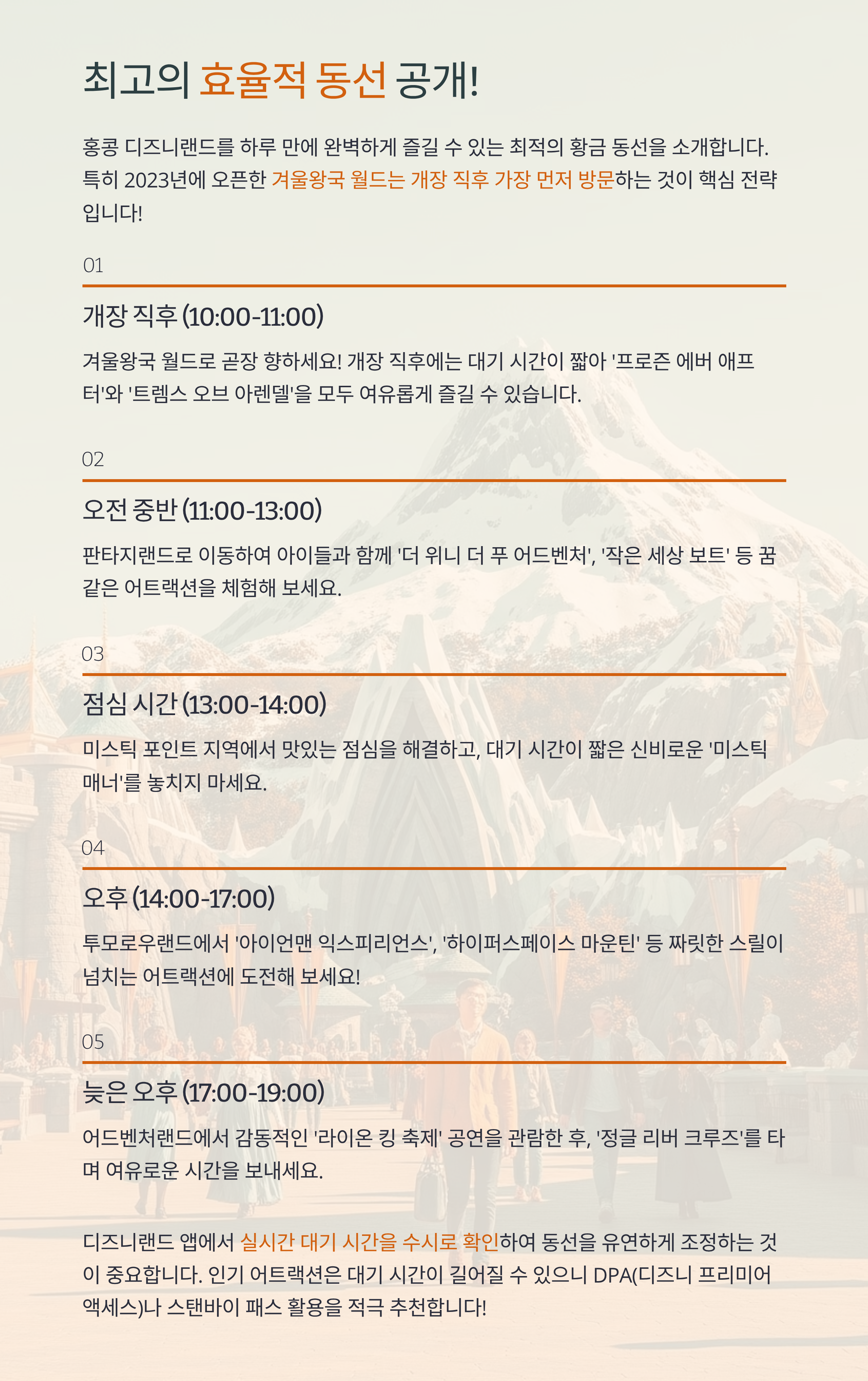 - **개장 직후 (오전 10시~11시):** 겨울왕국: 월드 오브 프로즌으로 직행! 개장 직후에는 대기 시간이 짧아 프론즌 에버 애프터와 트렘스 오브 아렌델을 모두 즐길 수 있습니다.