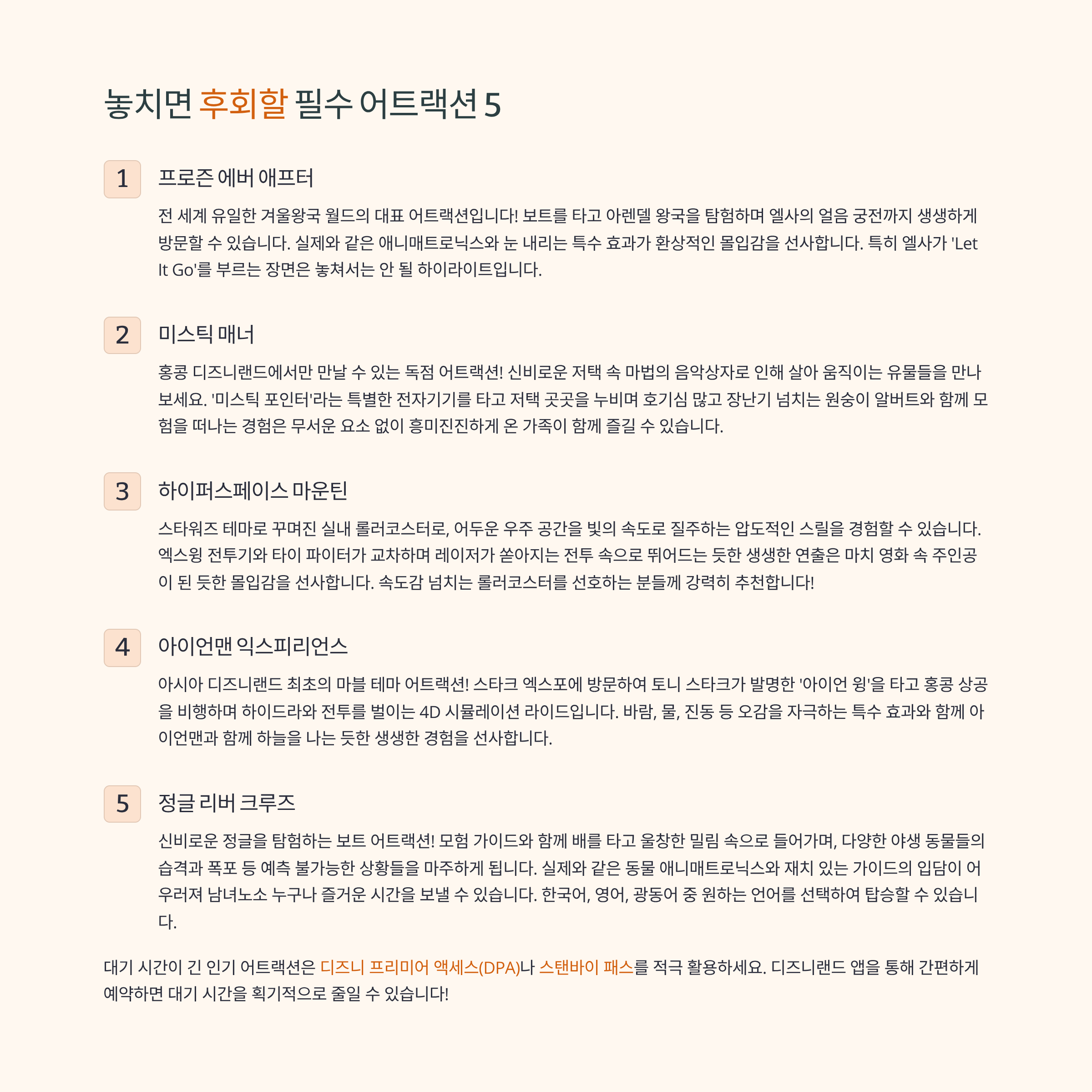 물론 이 코스는 예시일 뿐, 개인의 취향에 따라 자유롭게 조절할 수 있습니다. 인기 어트랙션의 대기 시간이 길다면, 디즈니 프리미어 액세스(DPA)를 구매하여 시간을 절약하는 것도 좋은 방법입니다.