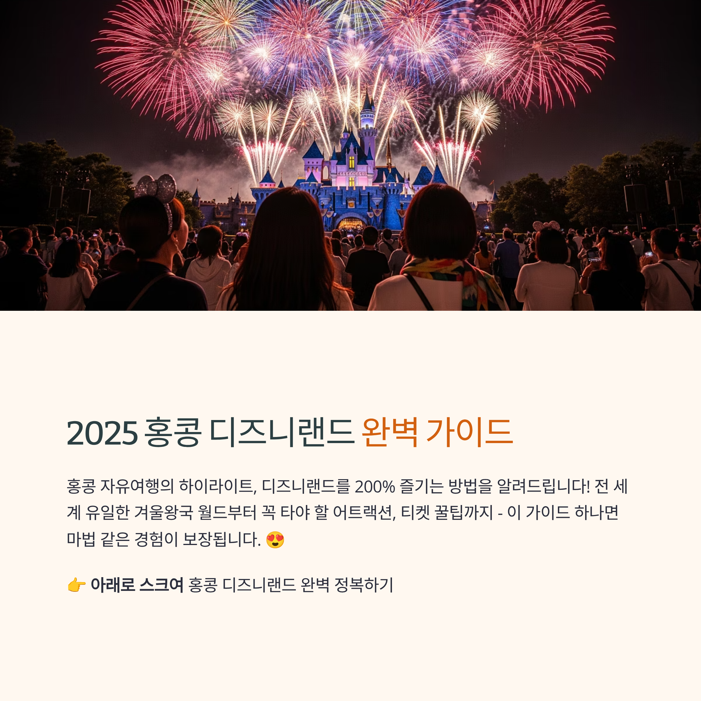 이 글에서는 2025년을 기준으로 홍콩 디즈니랜드를 가장 알차게 즐길 수 있는 최신 티켓 가격, 가장 효율적인 동선, 놓치면 후회할 어트랙션, 그리고 환상적인 불꽃놀이 명당자리까지 모든 것을 자세히 정리해 드립니다. 이 글 하나로 여러분의 홍콩 디즈니랜드 여행이 더욱 특별해질 거예요!