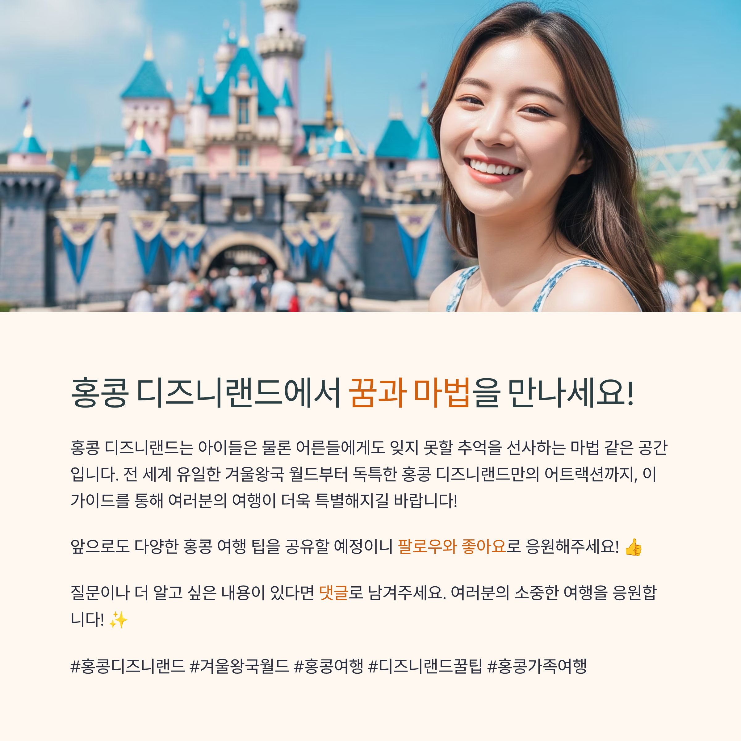 홍콩 디즈니랜드는 아이들은 물론 어른들에게도 잊지 못할 추억을 선물하는 마법 같은 공간입니다. 이 글이 여러분의 홍콩 디즈니랜드 여행 준비에 조금이나마 도움이 되기를 바라며, 즐겁고 행복한 추억 가득 만드시길 바랍니다!