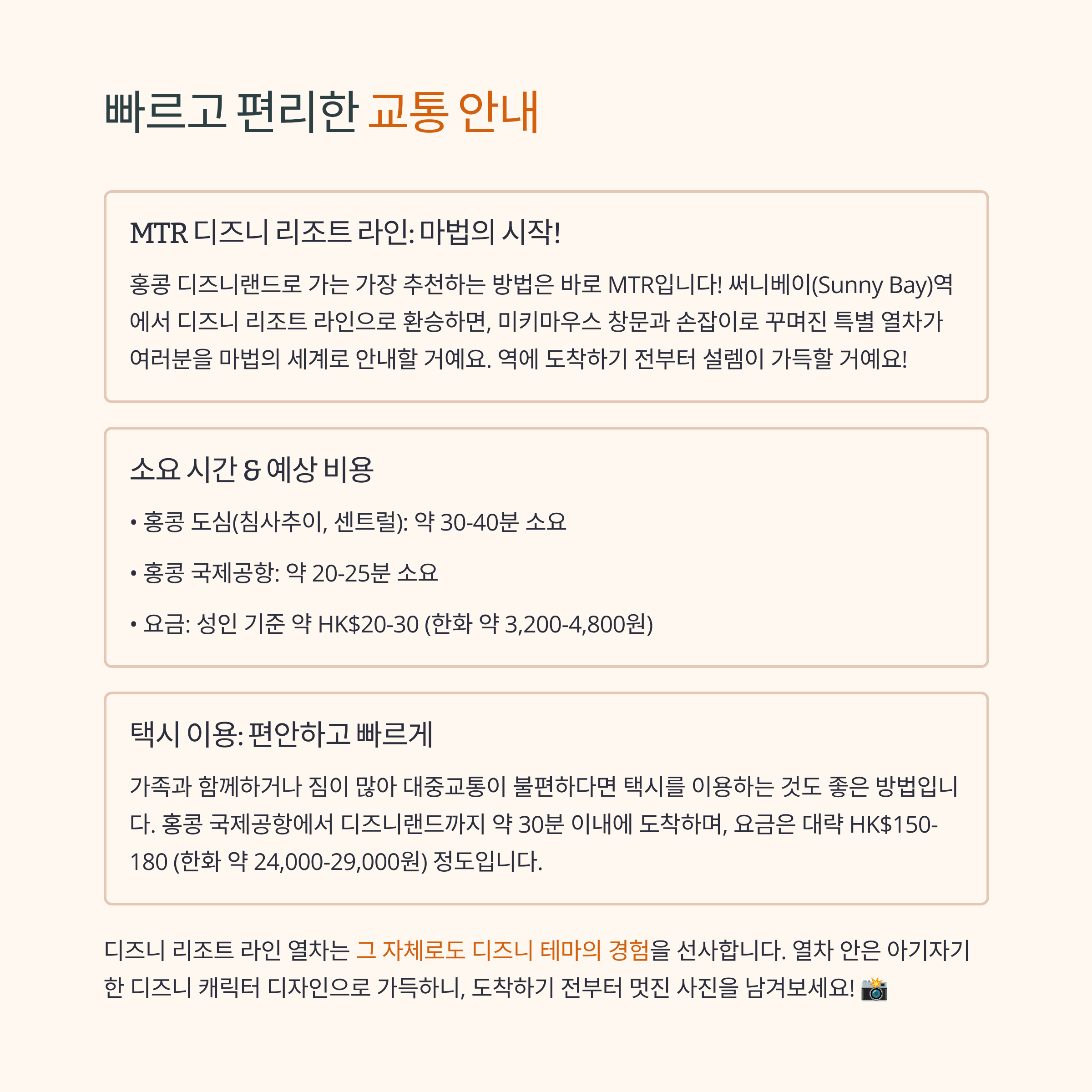 홍콩 시내나 공항에서 디즈니랜드까지는 지하철(MTR)이 가장 편리하고 빠릅니다. MTR은 홍콩의 효율적인 대중교통 시스템을 경험할 수 있는 좋은 방법이기도 합니다.