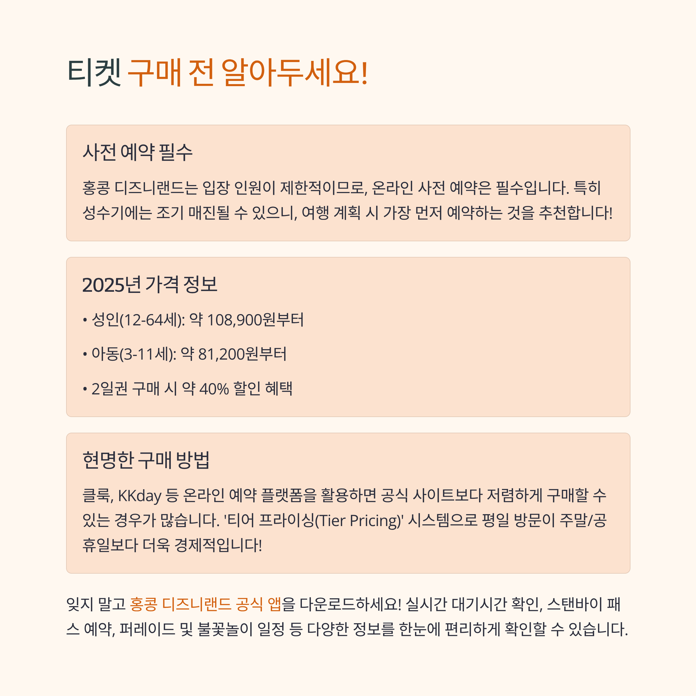 ✔️ 참고: 홍콩 디즈니랜드는 Tier Pricing 시스템을 운영합니다. 주말, 공휴일, 성수기에는 가격이 더 비싸므로, 티켓을 예매할 때 날짜별 가격을 꼼꼼하게 확인해야 합니다. 온라인 여행 플랫폼(클룩, KKday 등)을 이용하면 공식 홈페이지보다 저렴하거나 추가 혜택이 있는 경우가 많습니다.
