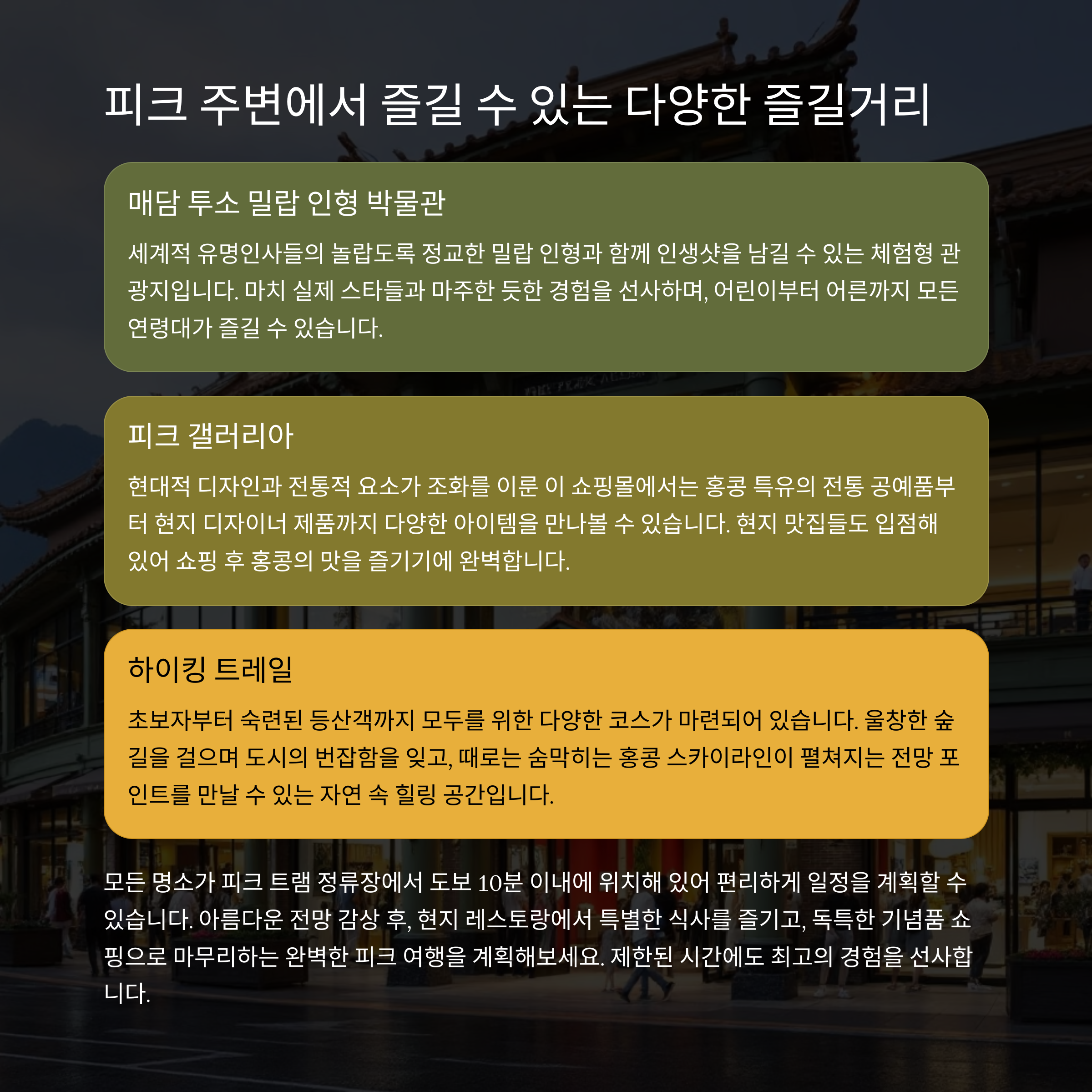 피크 트램 하차 후 바로 주변에서 모두 즐길 수 있어서