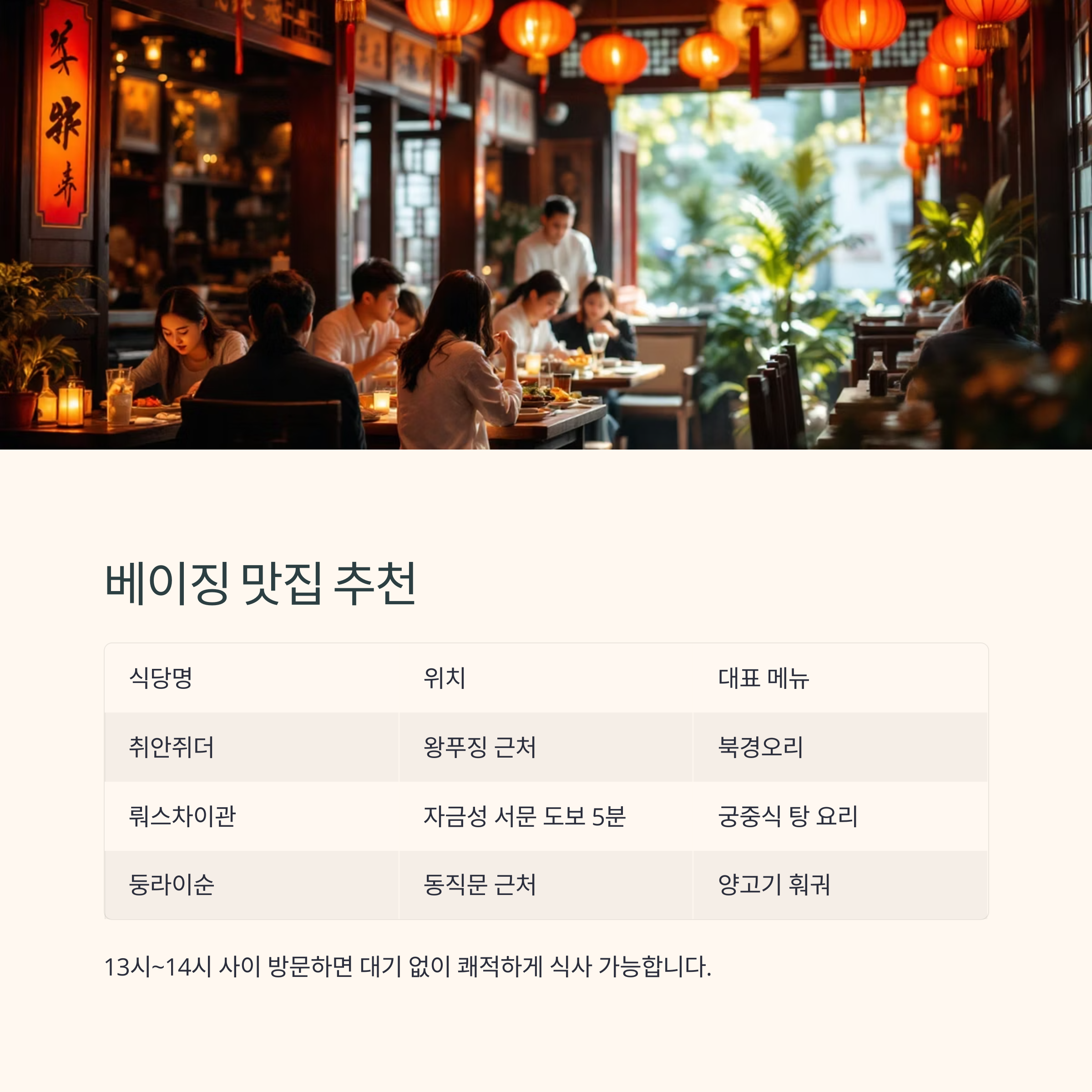 | 취안쥐더(全聚德) | 왕푸징 근처 | 북경오리 | 150년 전통, 관광객 필수 |