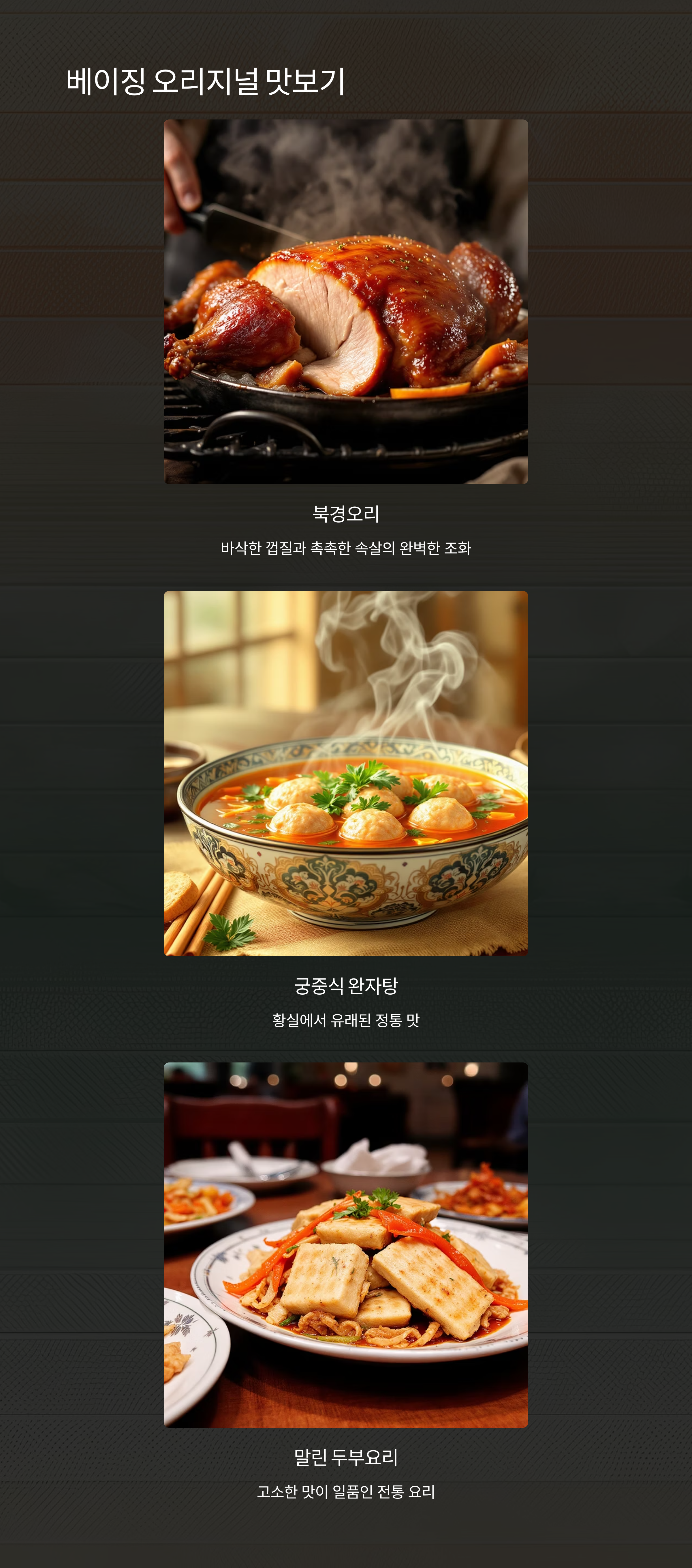 "북경오리는 바삭한 껍질과 촉촉한 속살의 조화가 일품이며,