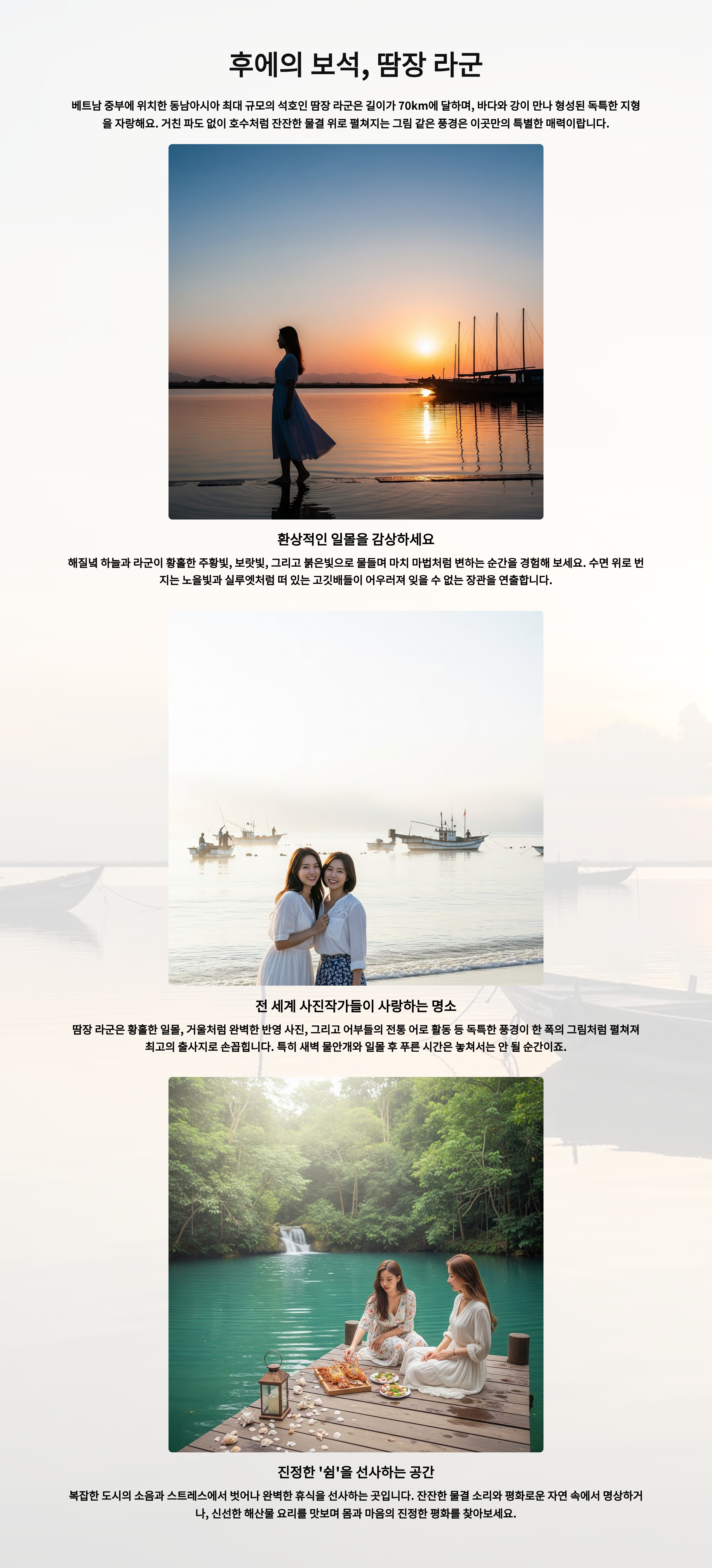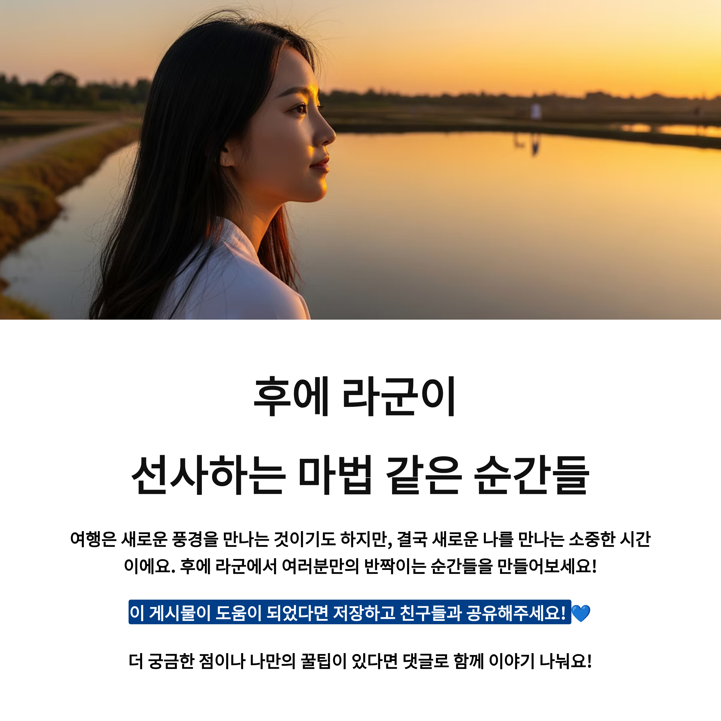 베트남의 숨겨진 보석, 고즈넉한 도시 후에(Huế)로의 여행을 계획하고 계신가요? 왕궁과 역사를 둘러보는 것도 좋지만, 후에의 진짜 매력은 바로 라군(Lagoon)에 있답니다. 끝없이 펼쳐진 잔잔한 호수 같은 바다, 라군은 그 어떤 휴양지에서도 느껴보지 못한 평화로움과 특별한 감성을 선물해요.