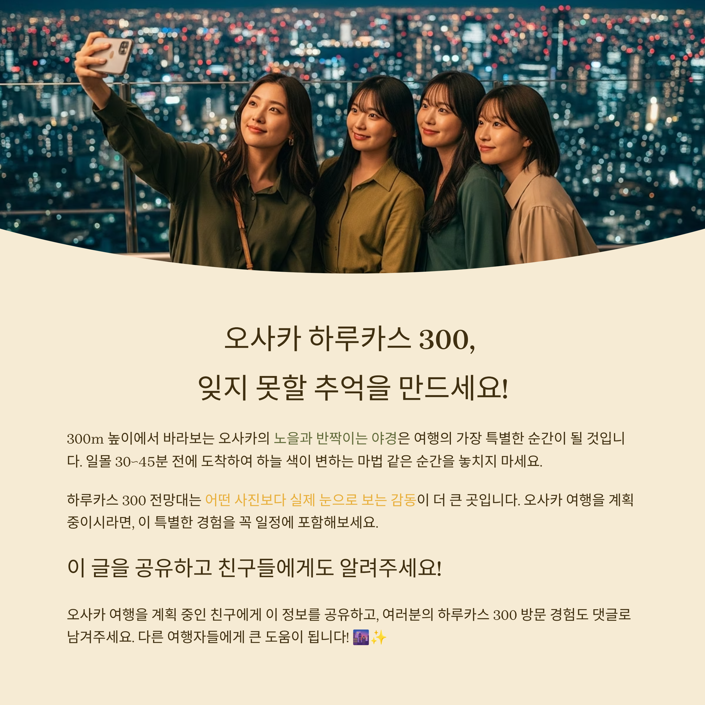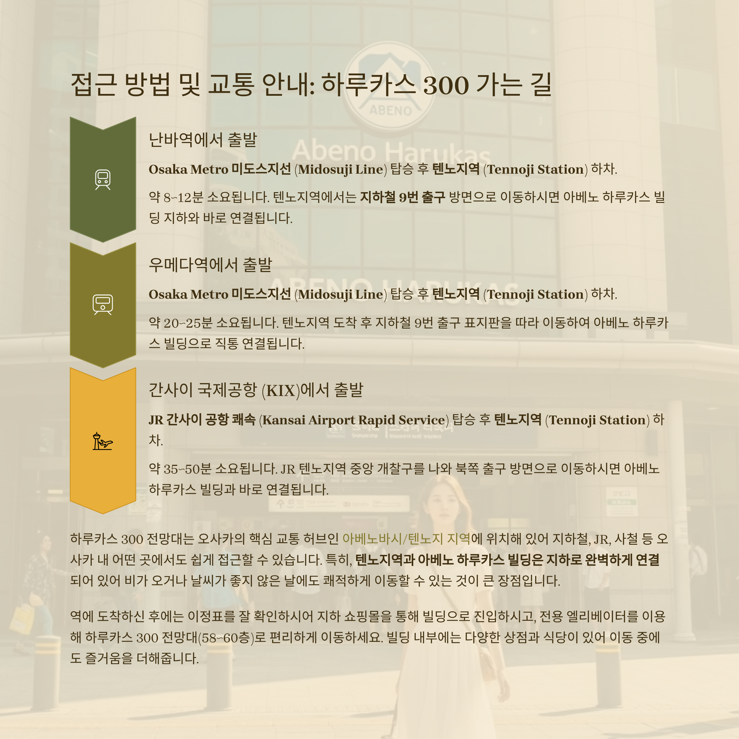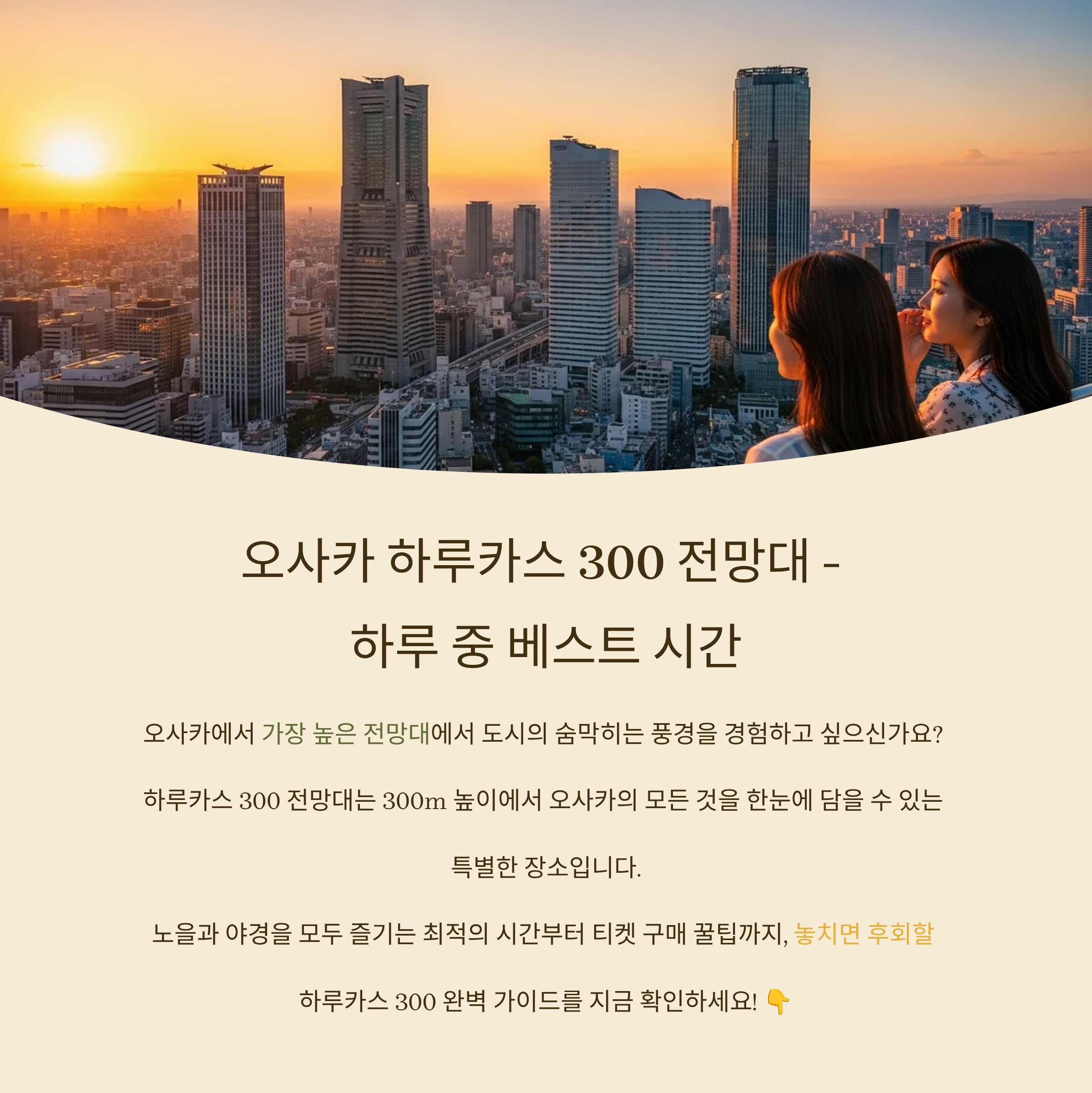 오사카 남부의 랜드마크 아베노 하루카스 최상층에 위치한 하루카스 300 전망대는 도시의 압도적인 스카이라인을 한눈에 담을 수 있는 최고의 명소예요. 이 글은 전망대 방문을 위한 필수 정보를 한곳에 모아뒀어요. 입장, 티켓, 추천 시간, 사진 팁, 일정표, 예산, FAQ까지 모두 확인해 보세요.