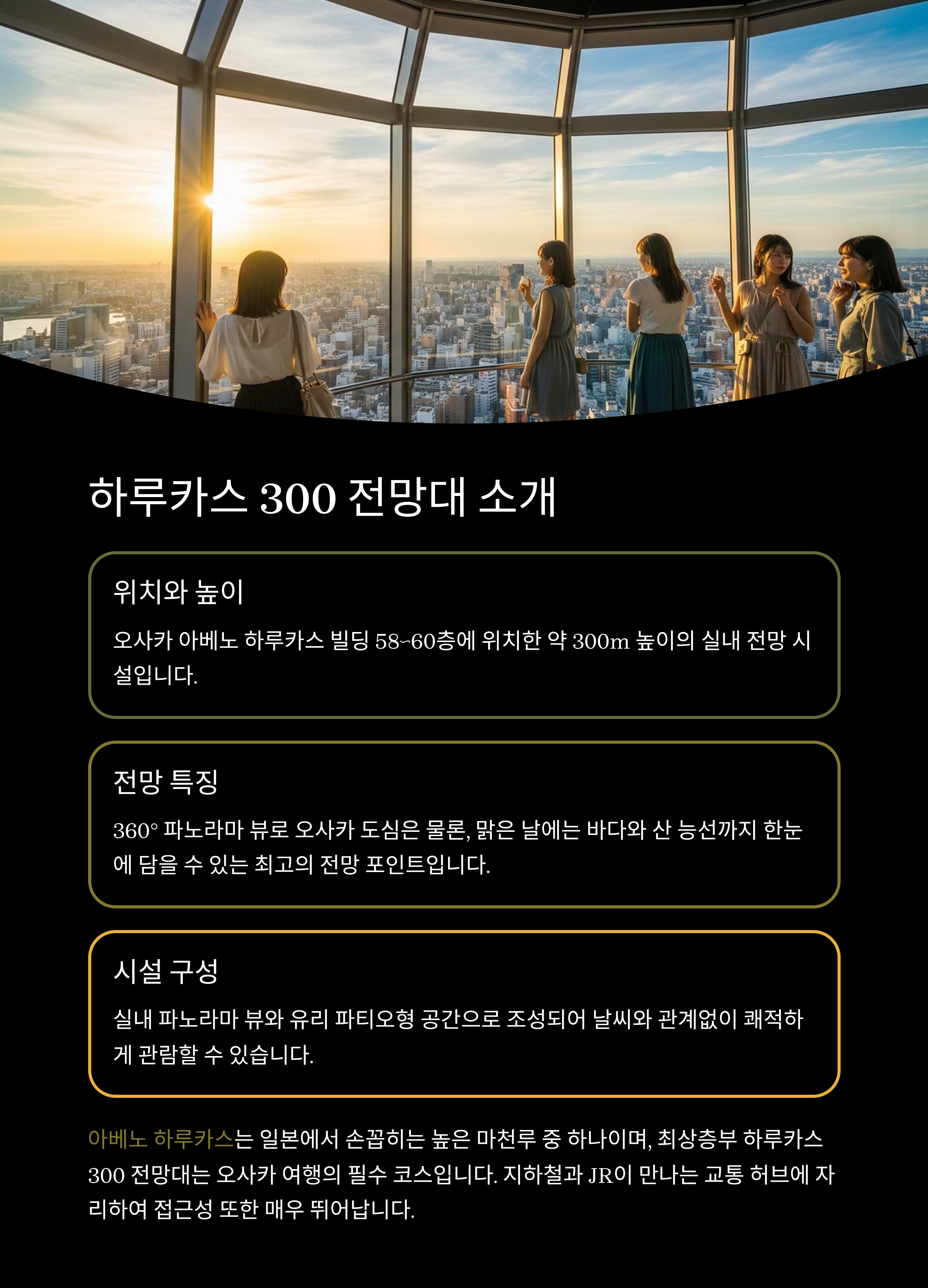 하루카스 300은 아베노 하루카스 최상층부(58층~60층)에 위치한 유료 전망 시설이에요. 실내 파노라믹 뷰와 탁 트인 유리 파티오형 공간이 특징이고요, 맑은 날에는 바다와 산 능선까지 선명하게 조망할 수 있어요.