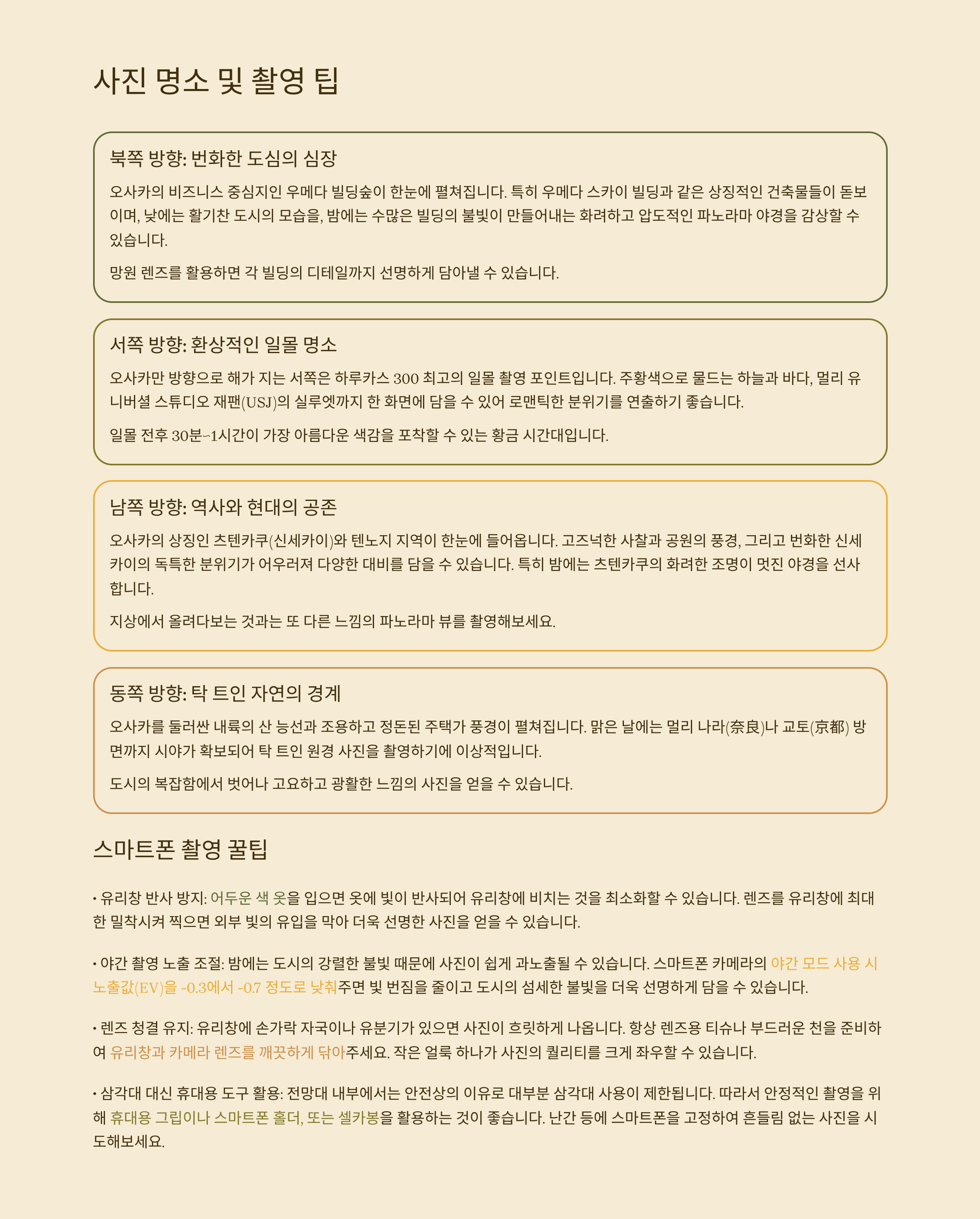 동서남북 파노라마가 가능해 방향별 랜드마크가 다르게 보여요. 일반적으로 북쪽은 우메다(도심 빌딩군), 서쪽은 바다 방향, 남쪽은 텐노지/신세카이(츠텐카쿠) 구역, 동쪽은 산 능선 조망으로 알려져 있어요.