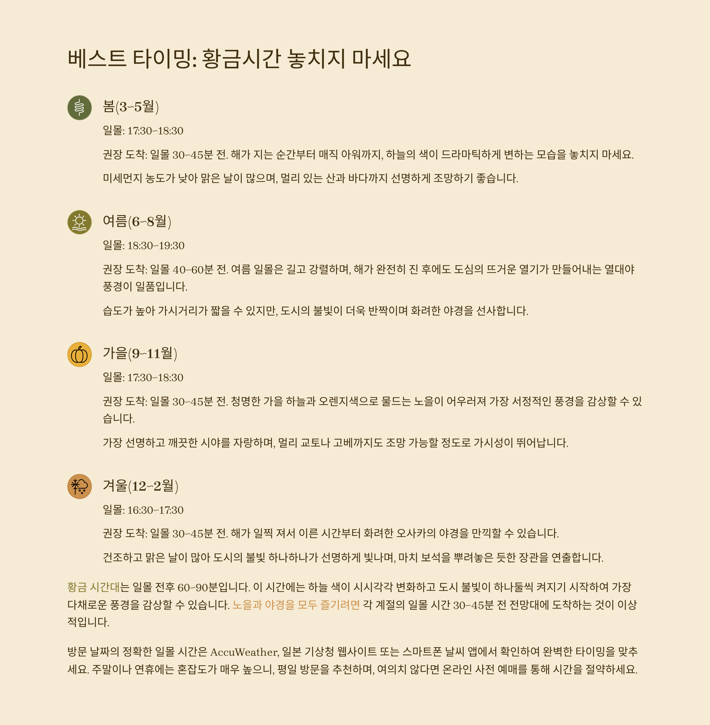 일몰 전후 60~90분은 하늘 색 변화와 도시 불빛이 겹치는 황금 구간으로 널리 추천돼요. 도착은 일몰 30~45분 전을 기준으로 잡으면 관람과 촬영을 여유롭게 즐길 수 있어요.