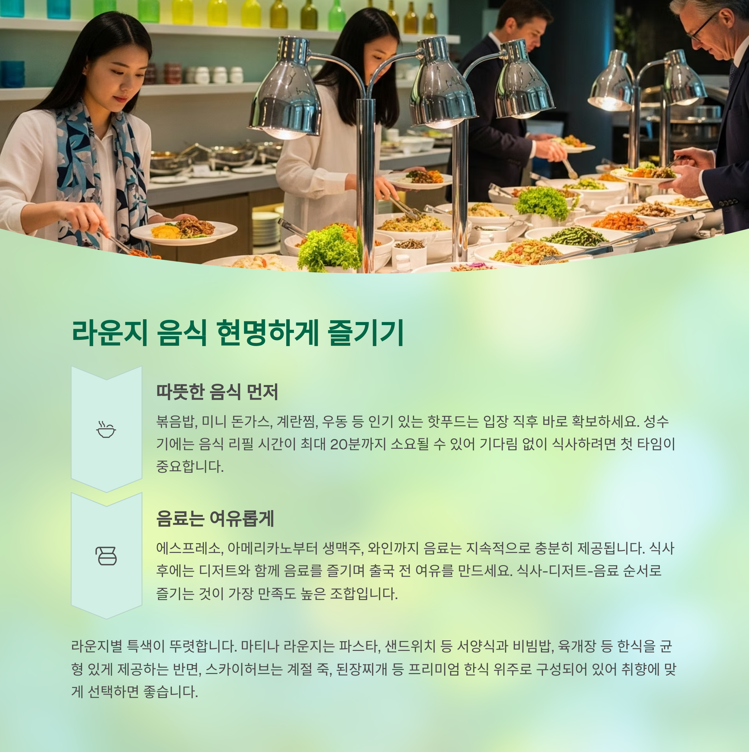 - 라운지 별로 메뉴 다양성 차이 큼 (마티나 vs 스카이허브 등)